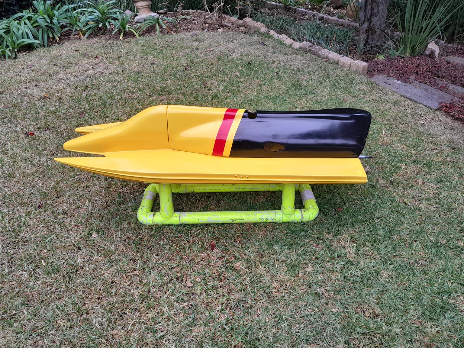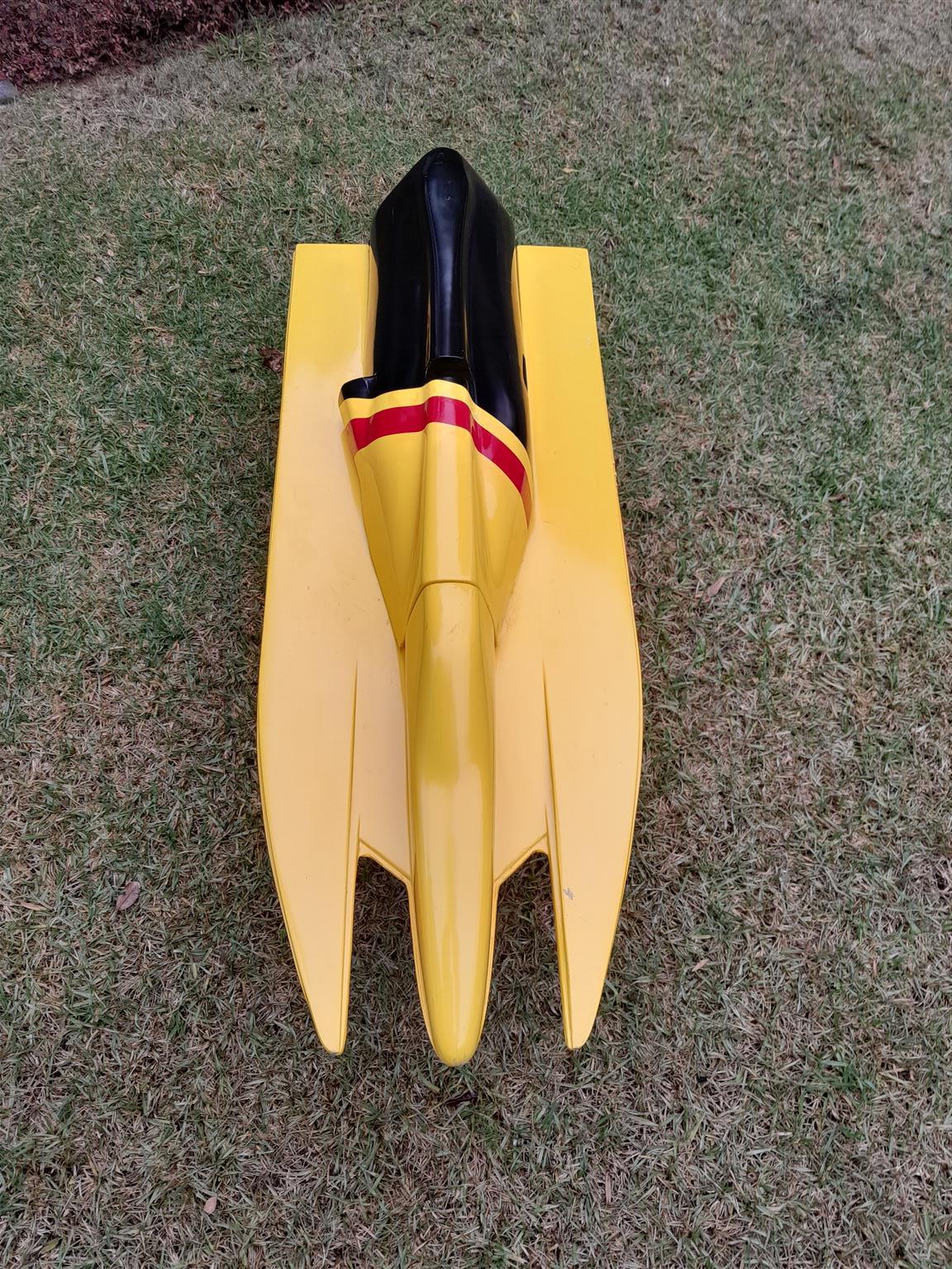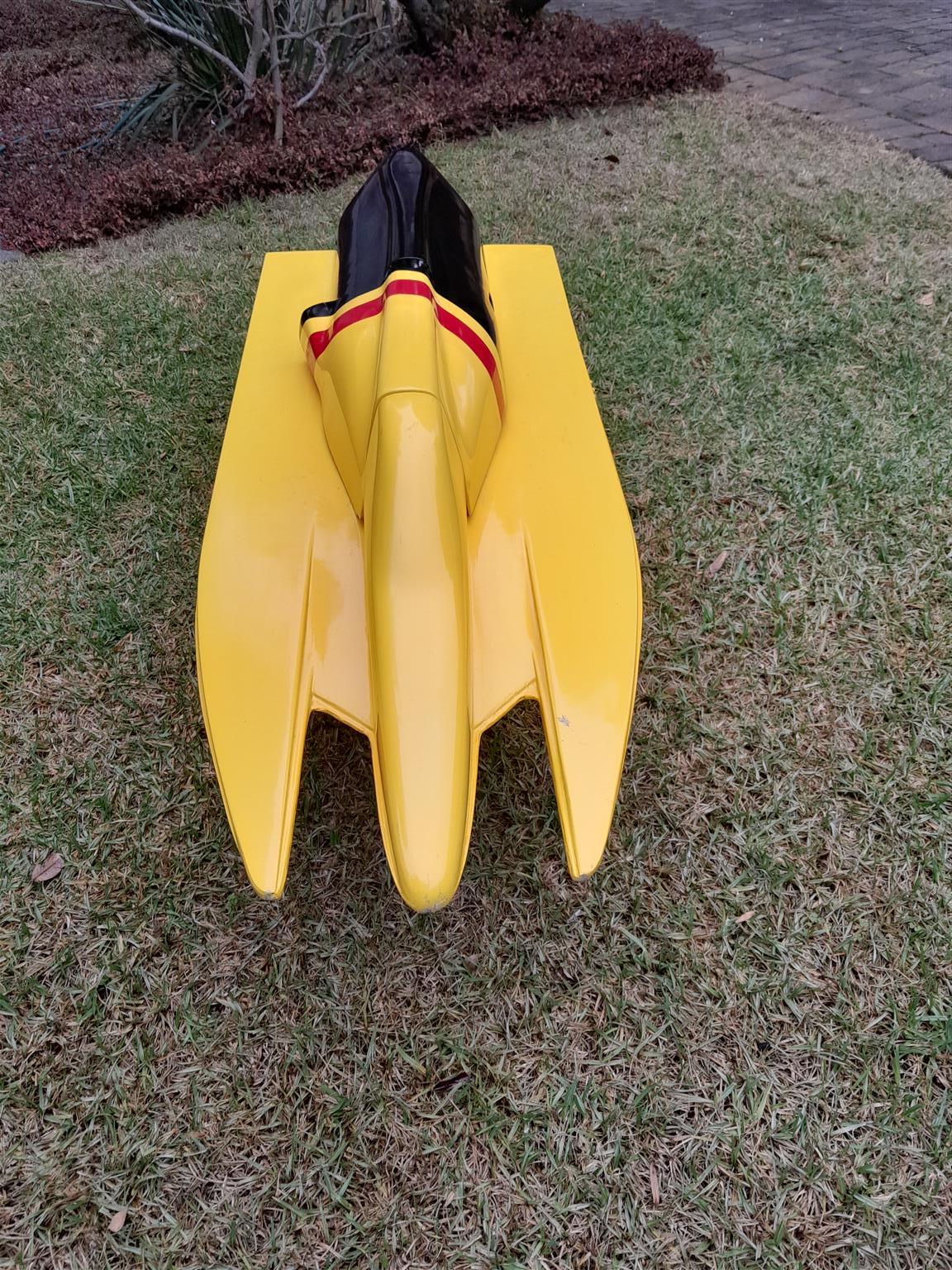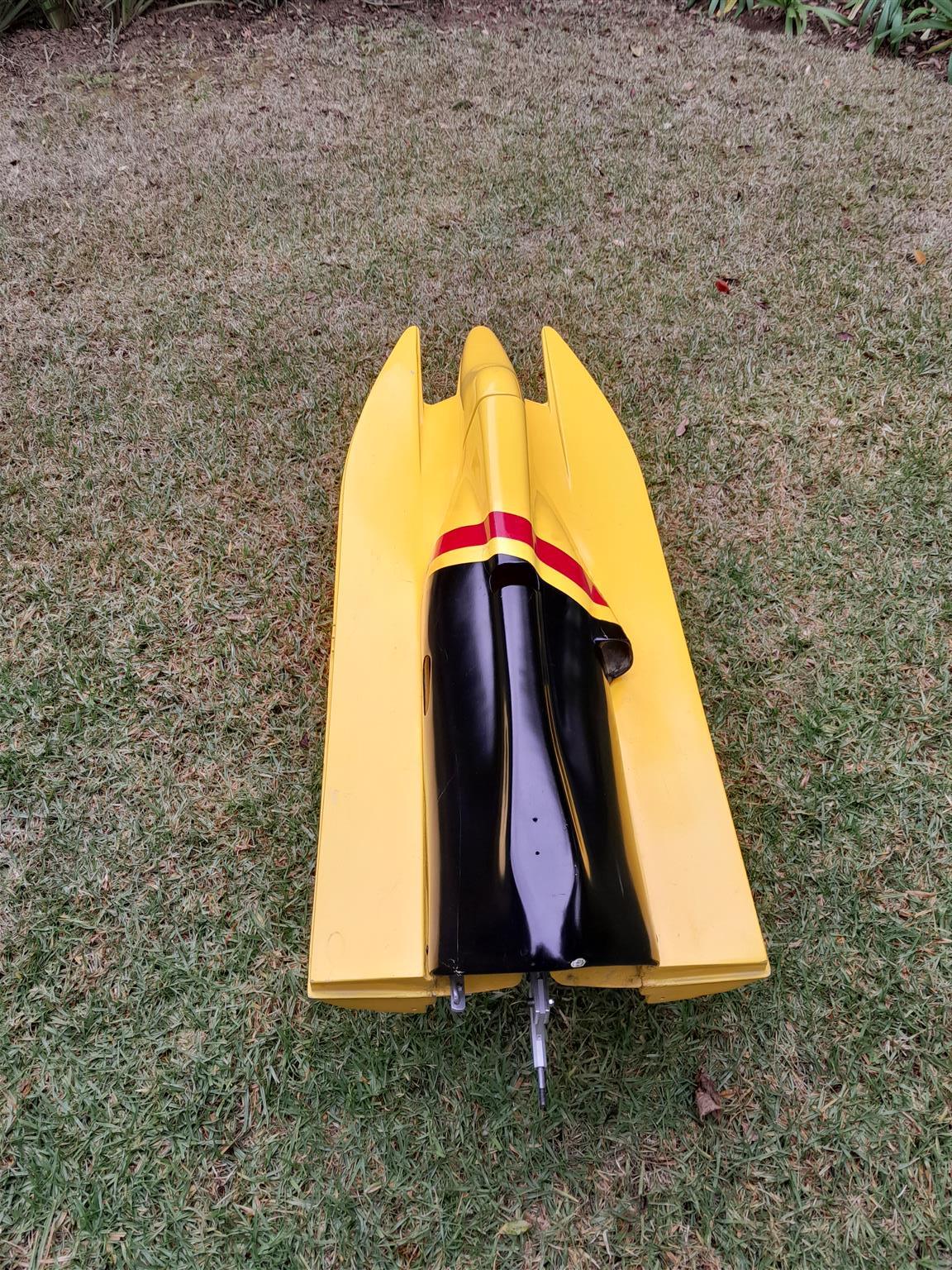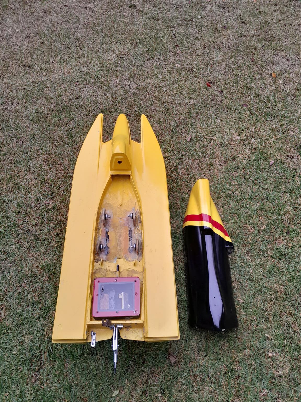 RC Formula 1 Fiberglass Racing Hull - for Gas engine. Length 1.113m. Extras are engine mounts, electrical box, water pick up, stinger / drive. R1700.