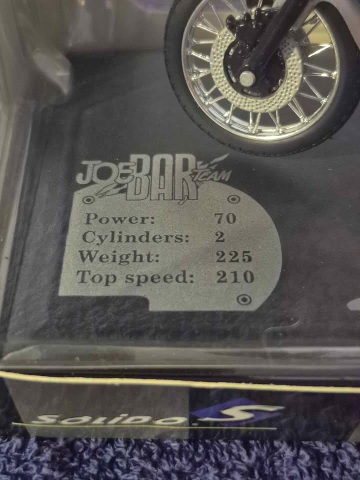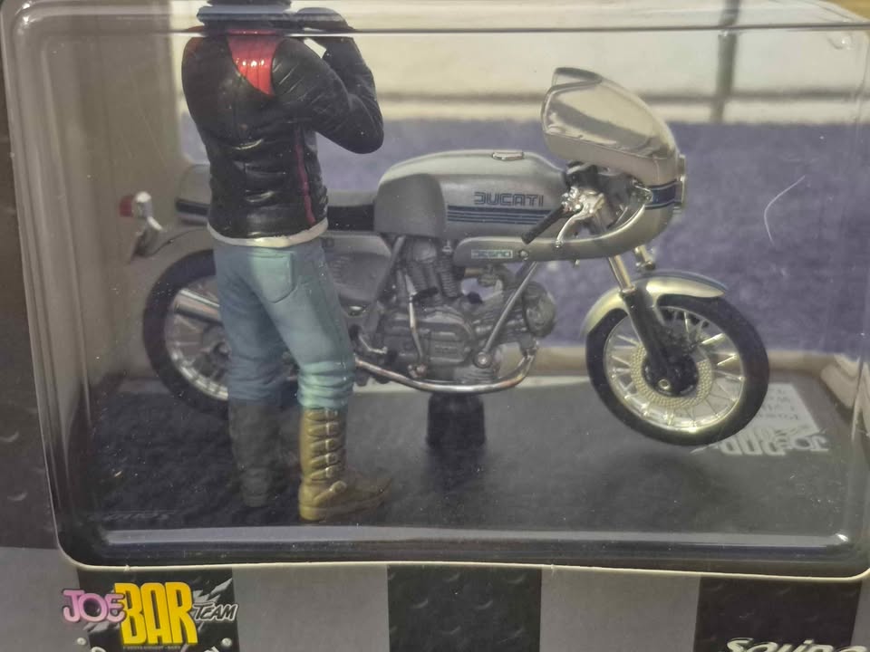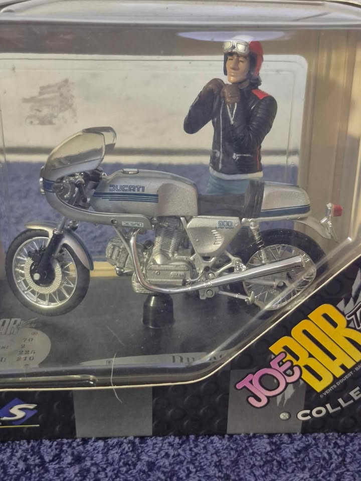 The model is produced by the company Solido, which has been making die-cast models since the 1930s. The model is a replica of the 1977 Ducati 900 SS. It is part of the "Joe Bar Team Collection," which features figures and motorcycles from the French comic series of the same name. The model is made of die-cast metal with plastic parts.