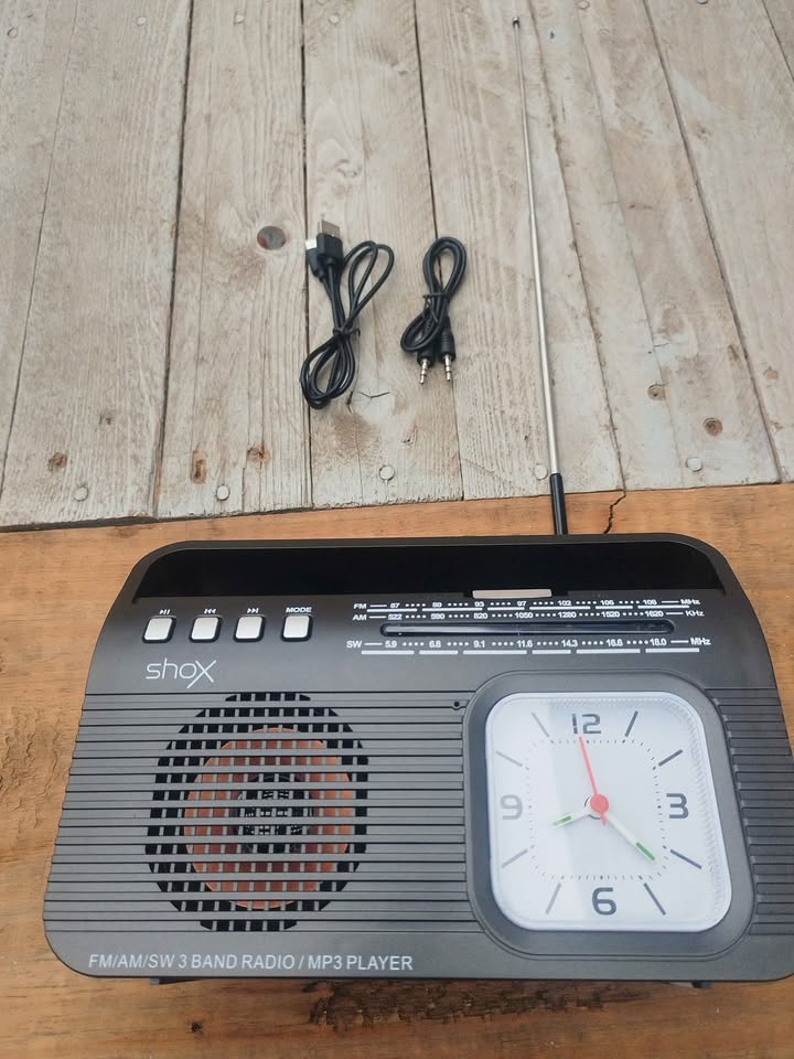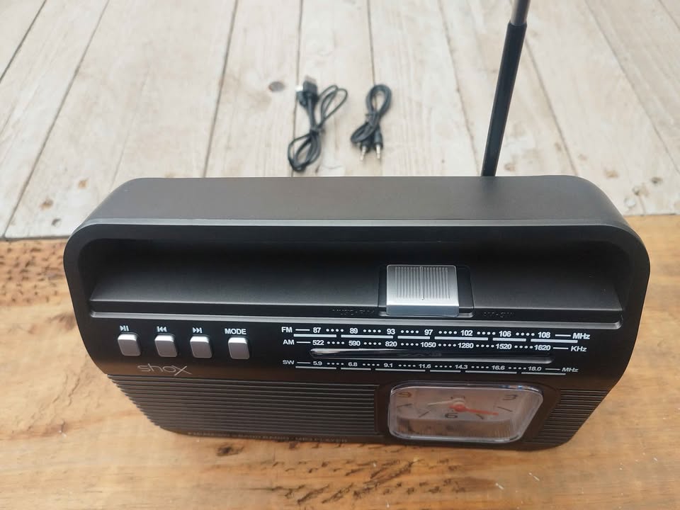 New ShoX Airwave Bluetooth Rechargeable Radio. Radio with FM, AM & SW (shortwave) functionality Rechargeable 3.7V lithium battery with up to 5 hours of playback to keep the party going Includes the latest Bluetooth 5.0 with 10m wireless range Listen to tunes straight from your USB with USB plug & play Extendable antenna for radical reception Auxiliary & micro SD inputs 3.5mm aux cable & USB charging cable included.
