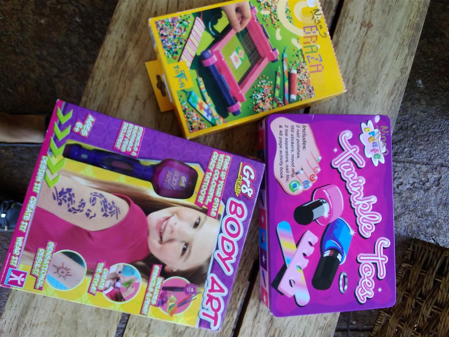 3 LOVELY KITS FOR CHILDREN TO PLAY WITH , INCLUDES WEAVING AND BEADING, TOENAIL PAINTING AND FUN BODY TATTOOS