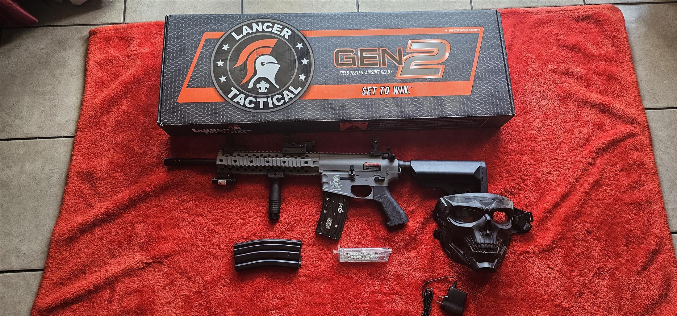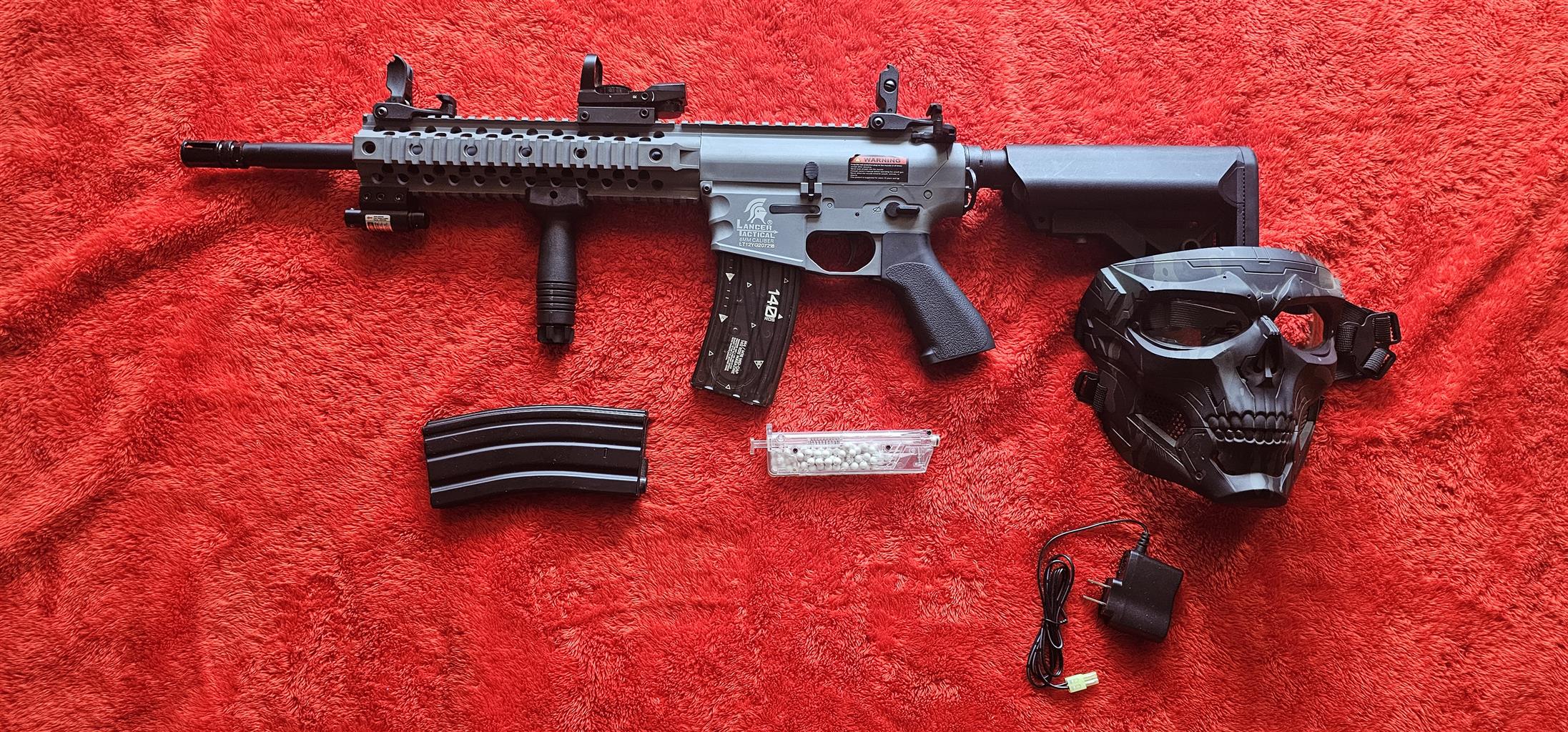Airsoft gun exstra mag speedloader mask laser and red dot scope . More details: