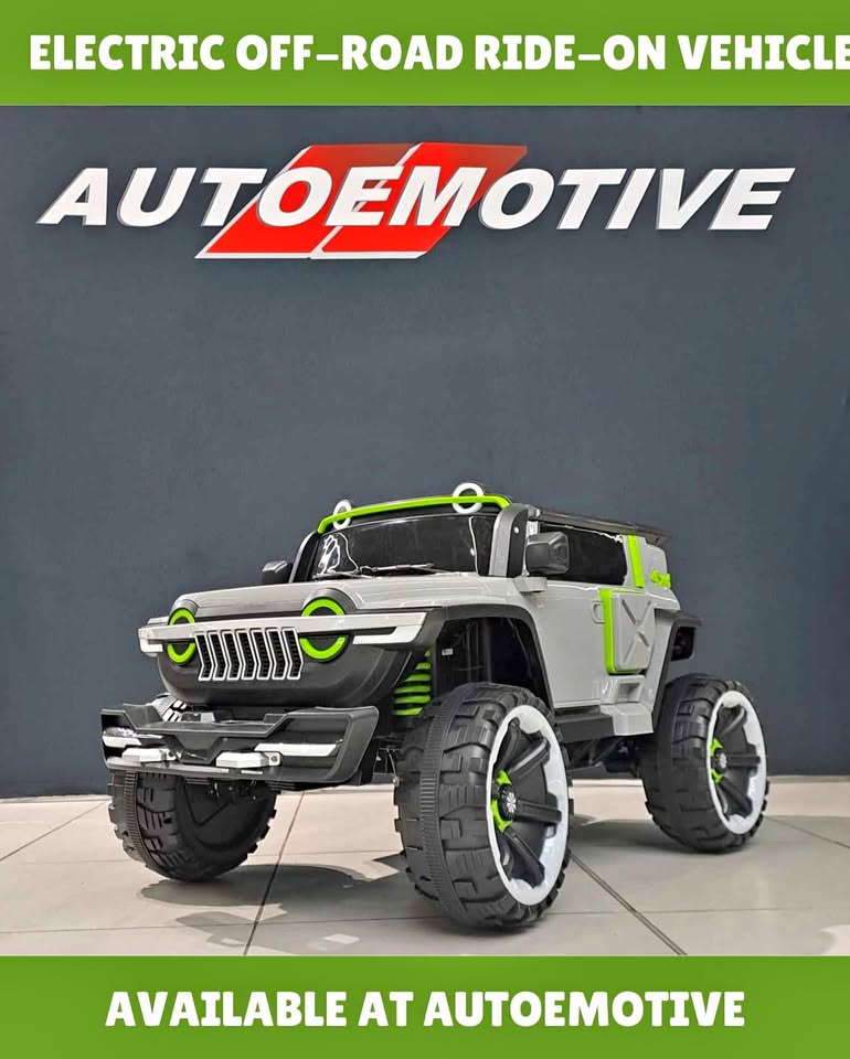This electric off-road ride-on vehicle is a stylish and rugged toy designed for adventure-loving kids. With its bold design inspired by real off-road SUVs, it features oversized all-terrain wheels, a durable frame, and eye-catching green accents. The vehicle includes realistic details such as a front grille, headlights, and a sturdy roll bar, making it look just like a miniature off-roading beast. Perfect for young explorers, this ride-on car offers a thrilling and safe driving experience. Now available at Autoemotive! 📞 | 📍1 Palm Blvd, Parkade B, Level 2, Shop F110