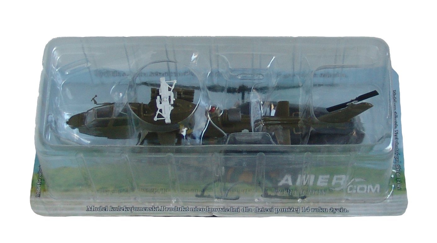 This die cast model represents military light attack helicopter,developed in the 1960s. Started service with the U.S. military in the Vietnam War. Cobra can perform anti-armor, air cavalry and armed reconnaissance roles and can attack point targets with its anti-armor and anti-helicopter capabilities. Model packed in blister.The main body of the helicopter is die cast metal. Some of the smaller attached accessory pieces like the air speed sensor and missile mounts are made of plastic.