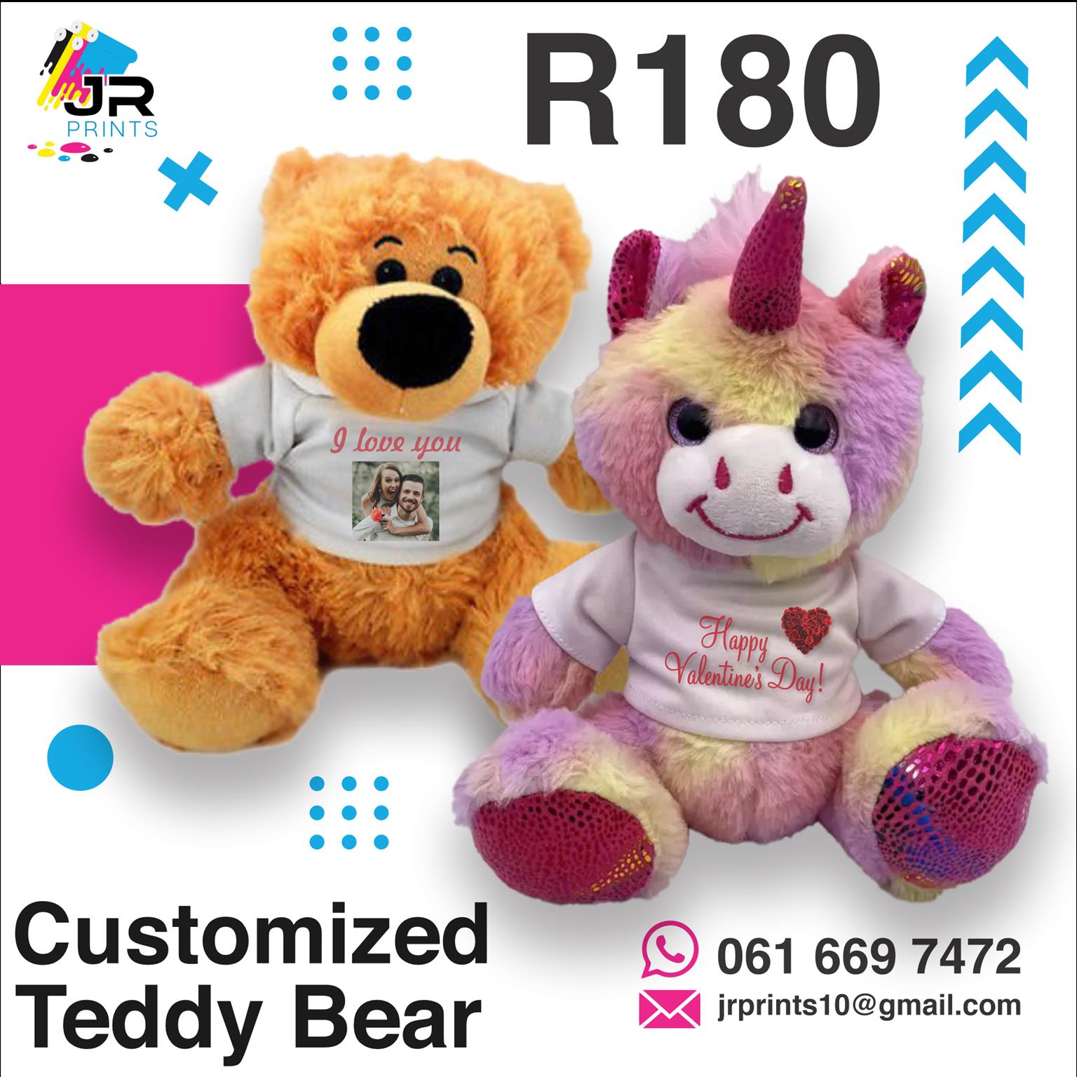 Our customized teddy bears are the ideal way to say "I love you" on Valentine's Day, whether it's a special date, a romantic message, or a beloved picture. We do the following as well: magic mugs, canvas, keyrings, t-shirt printing and many more gifts. WhatsApp us on 0616697472view more to place your order. Courier available all over SA. Reseller prices available.