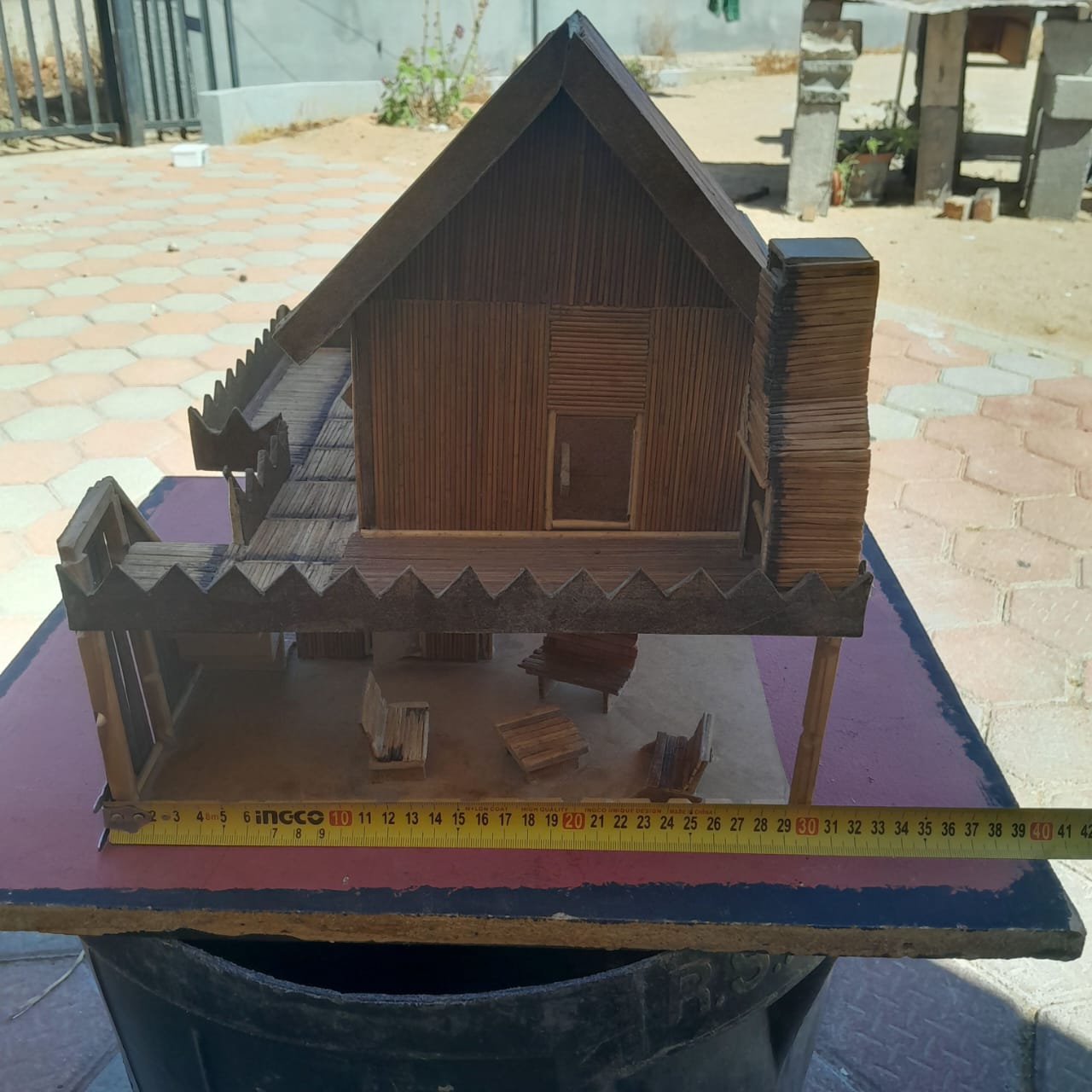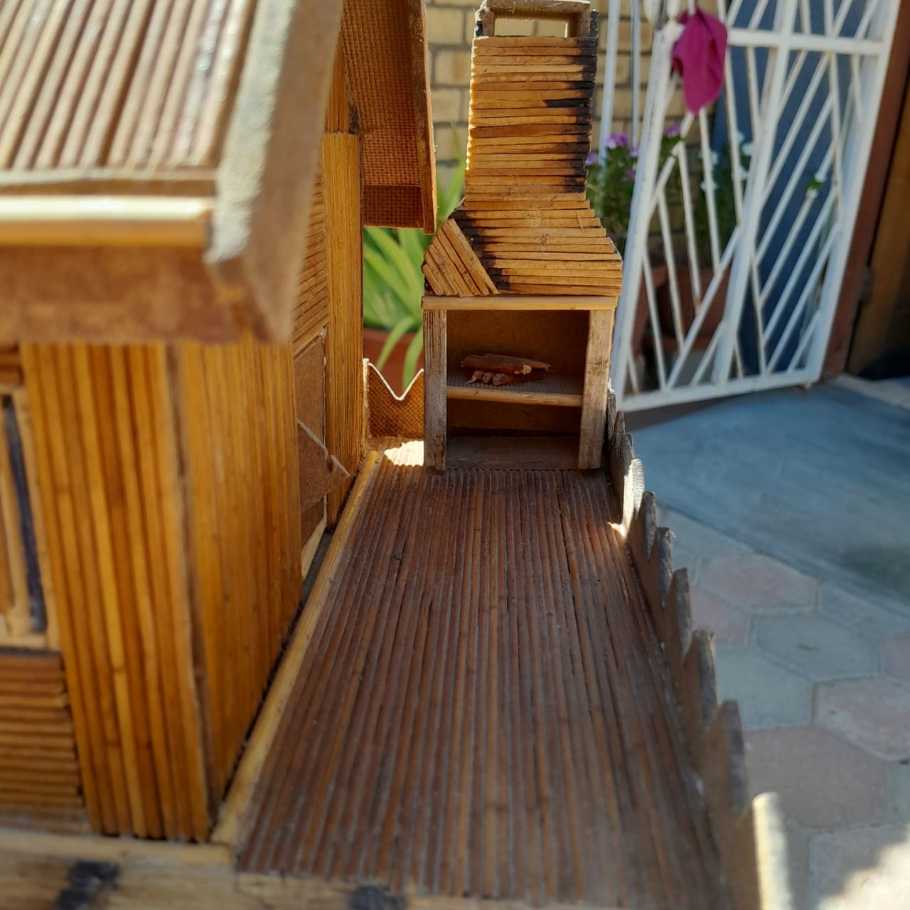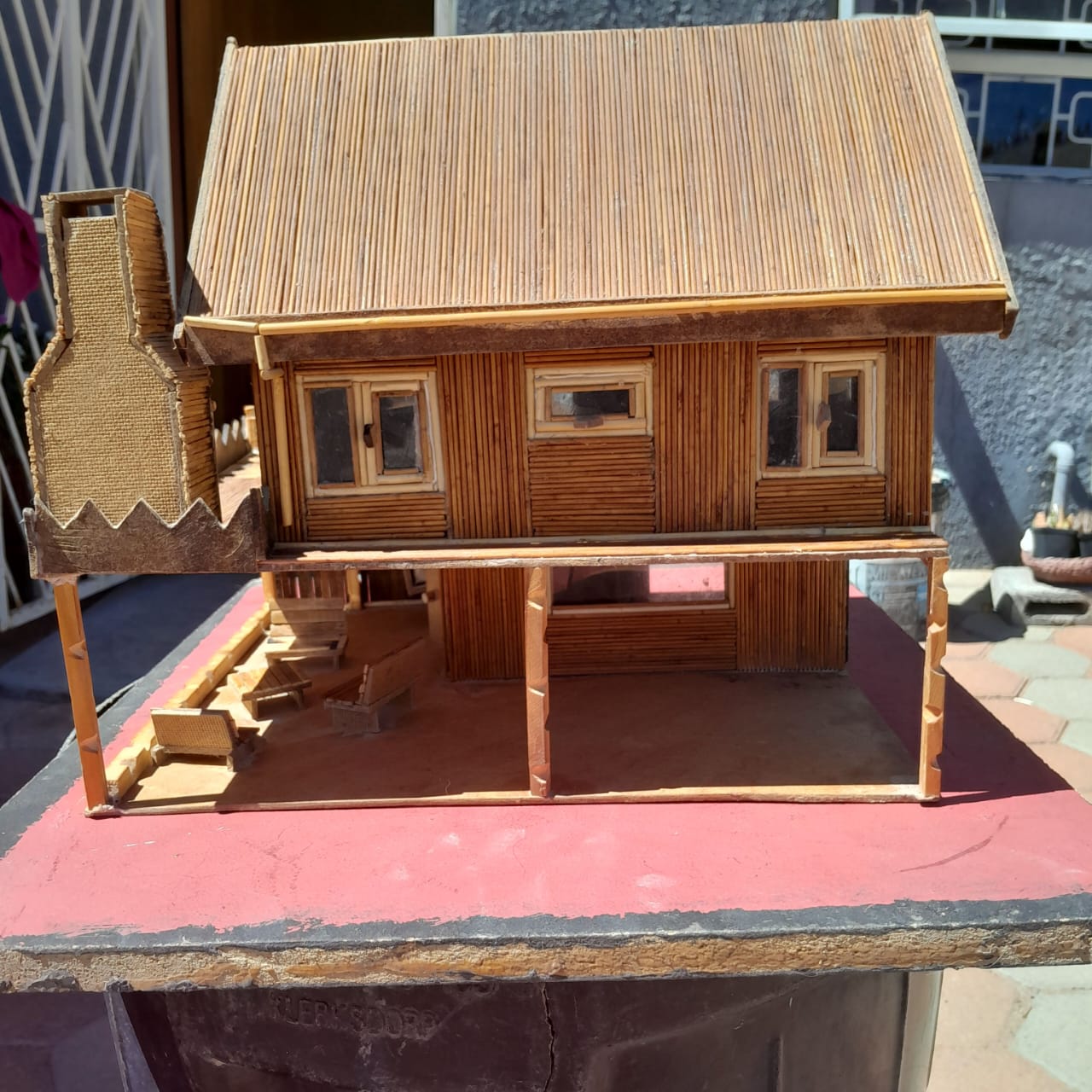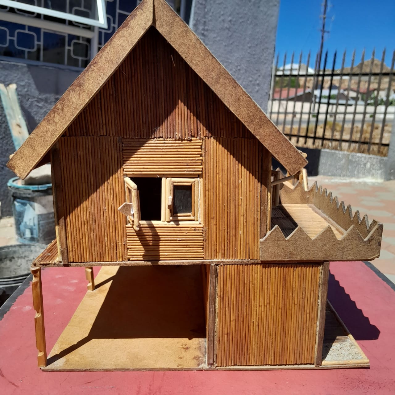 double storey woodenhouse built with matchsticks, reeds, carton, planks.