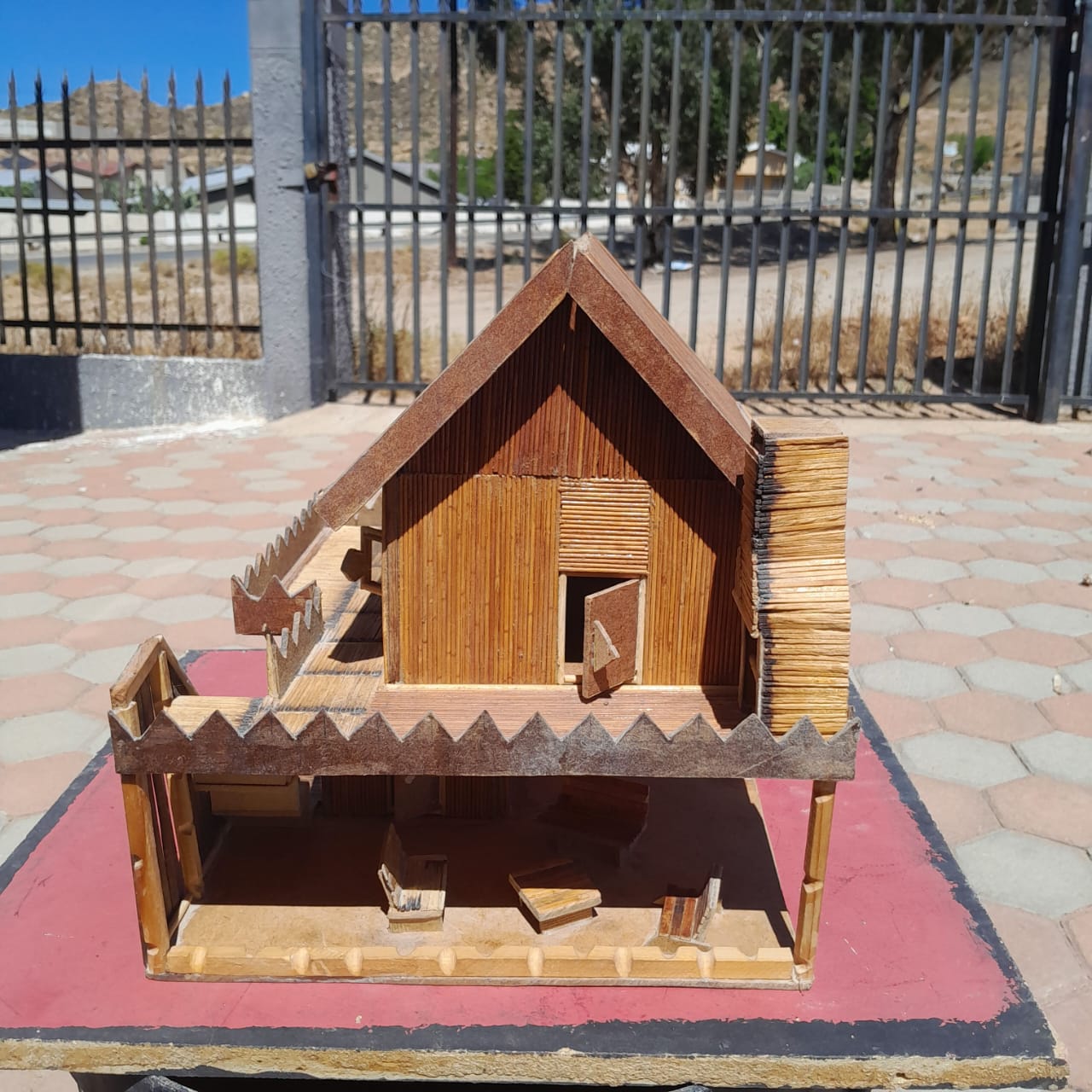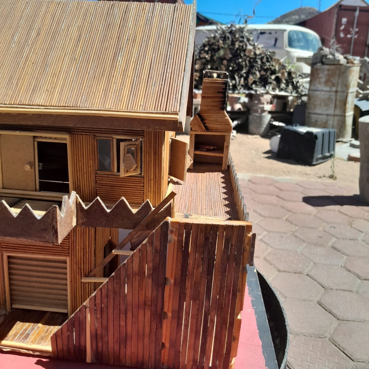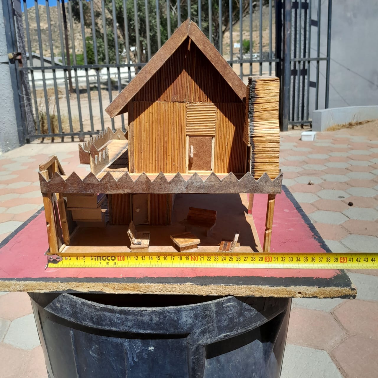 double storey woodenhouse built with matchsticks, reeds, carton, planks.