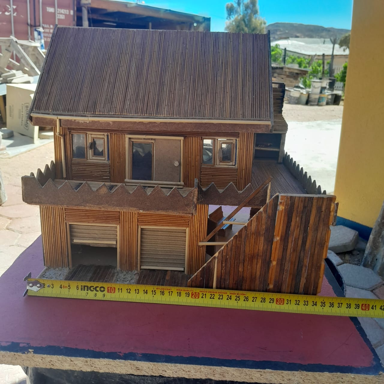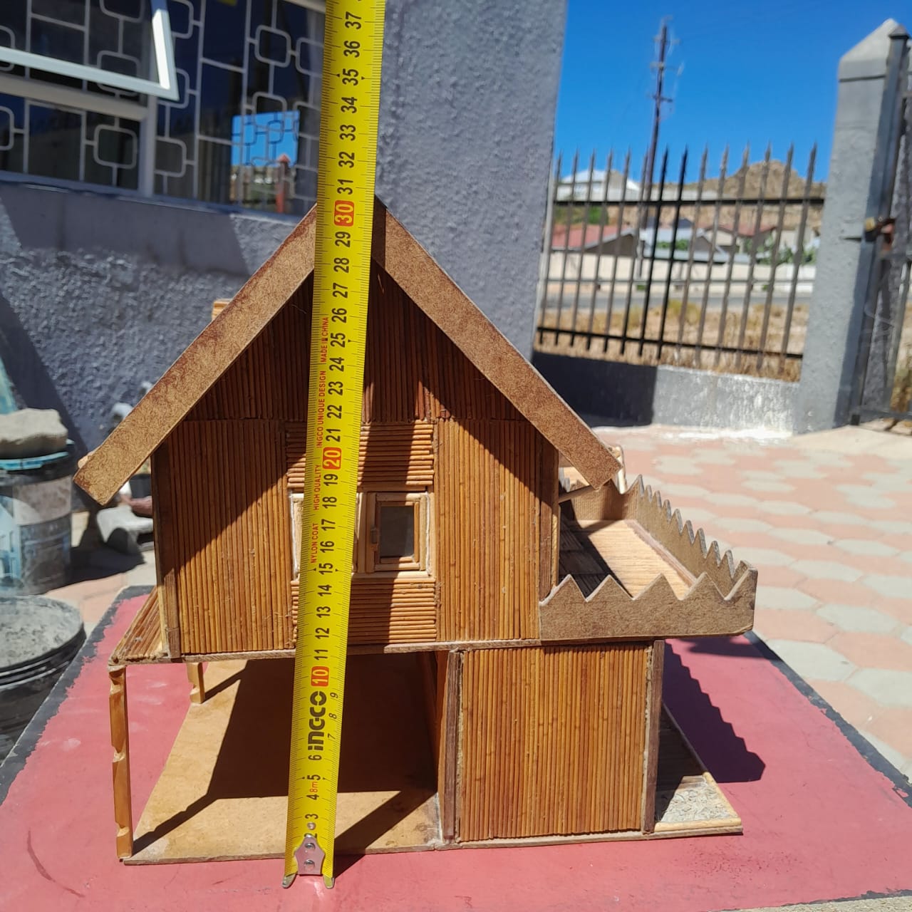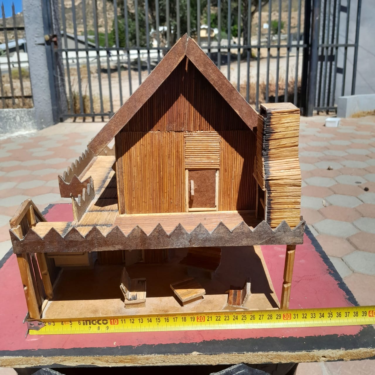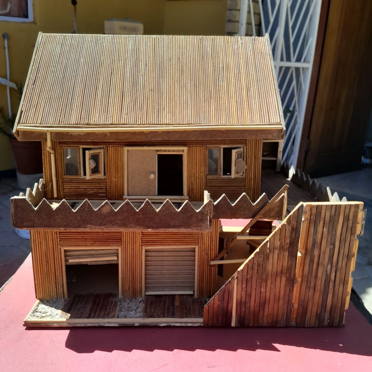 double storey woodenhouse built with matchsticks, reeds, carton, planks.