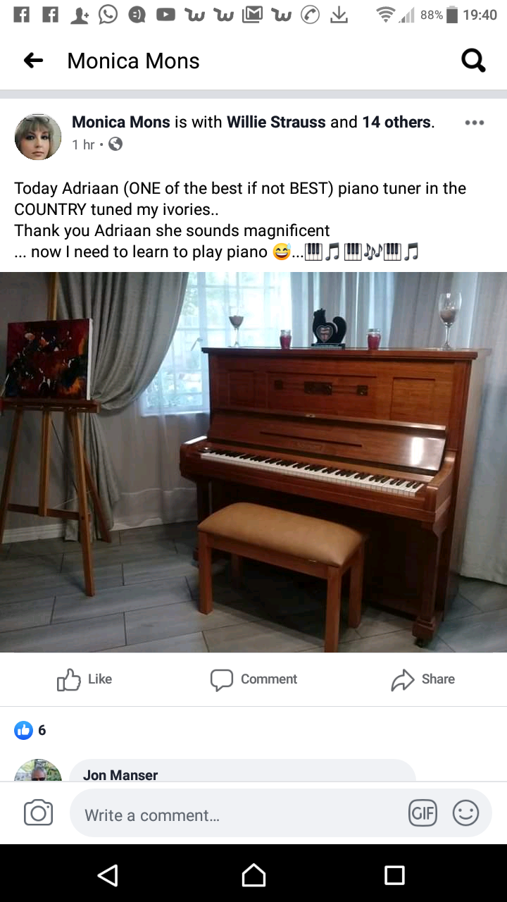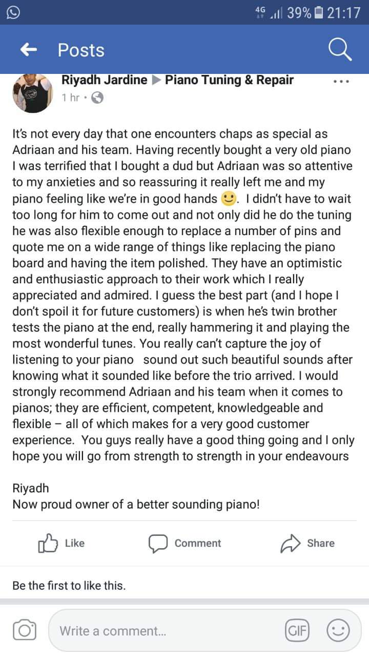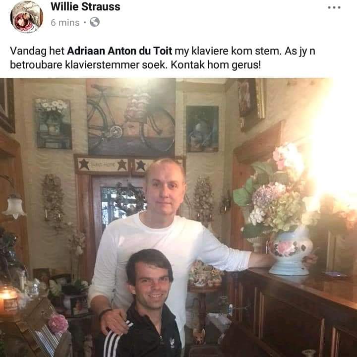 I am a trained piano tuner and technician. I tune and repair all upright and grand pianos. Feel free to contact or to whatsapp me on 084 440 1350view more. Tuning prices from R 850 depending on distance.