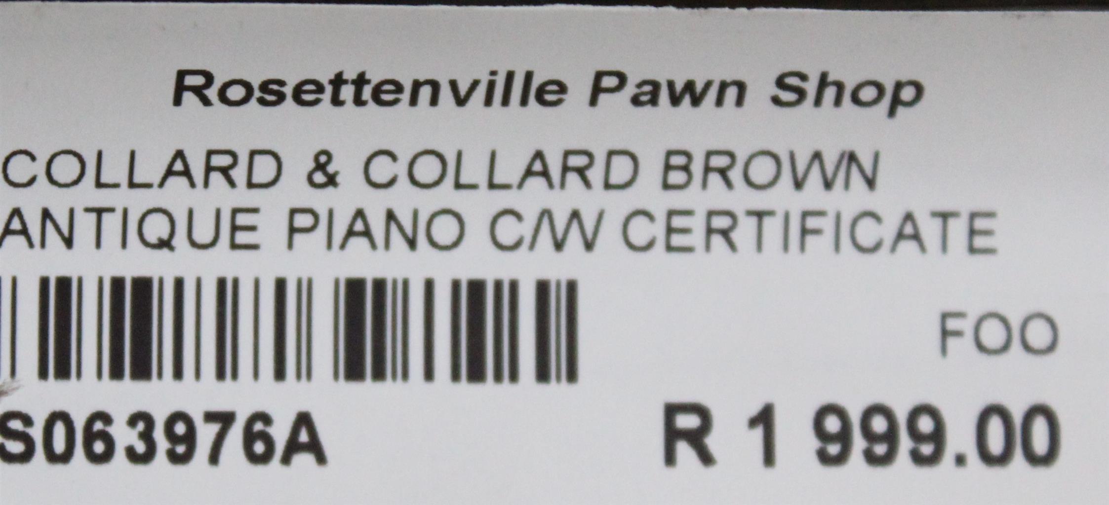 COLLARD & COLLARD BROWN ANTIQUE PIANO C/W CERTIFICATE