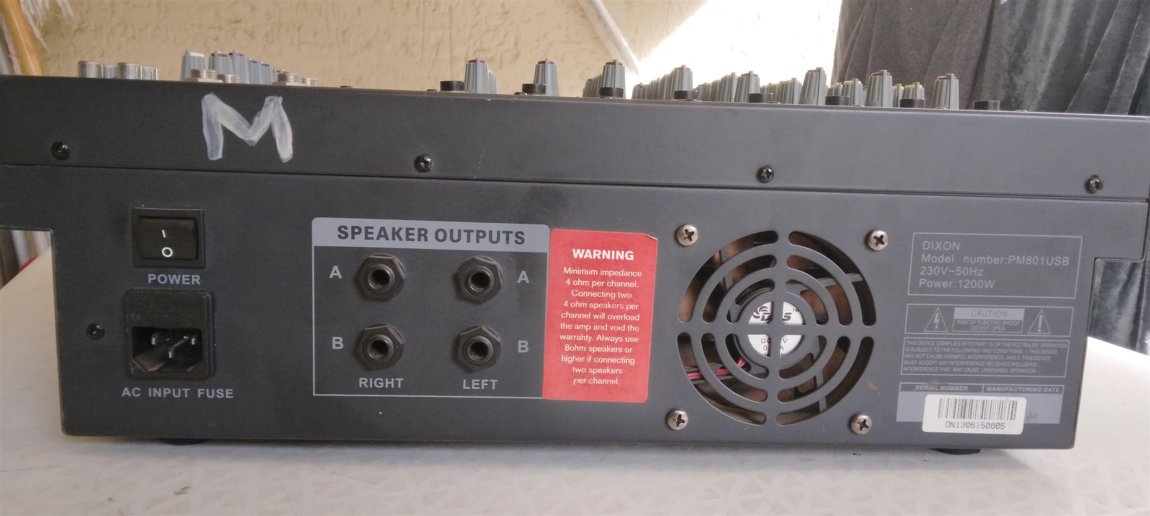 Used Dixon 8 Channel Powered Mixer. Model no: PM801USB. 1200W. R2000.