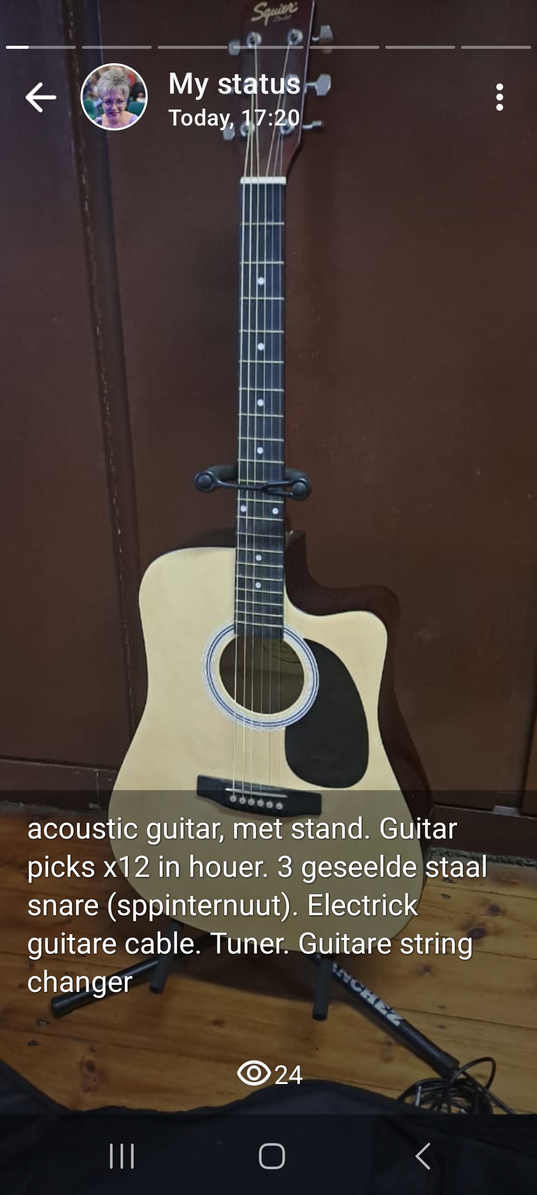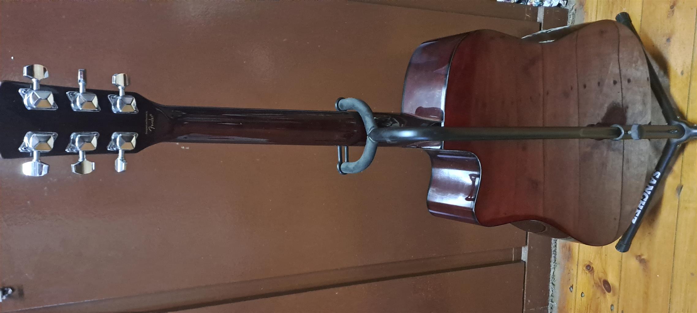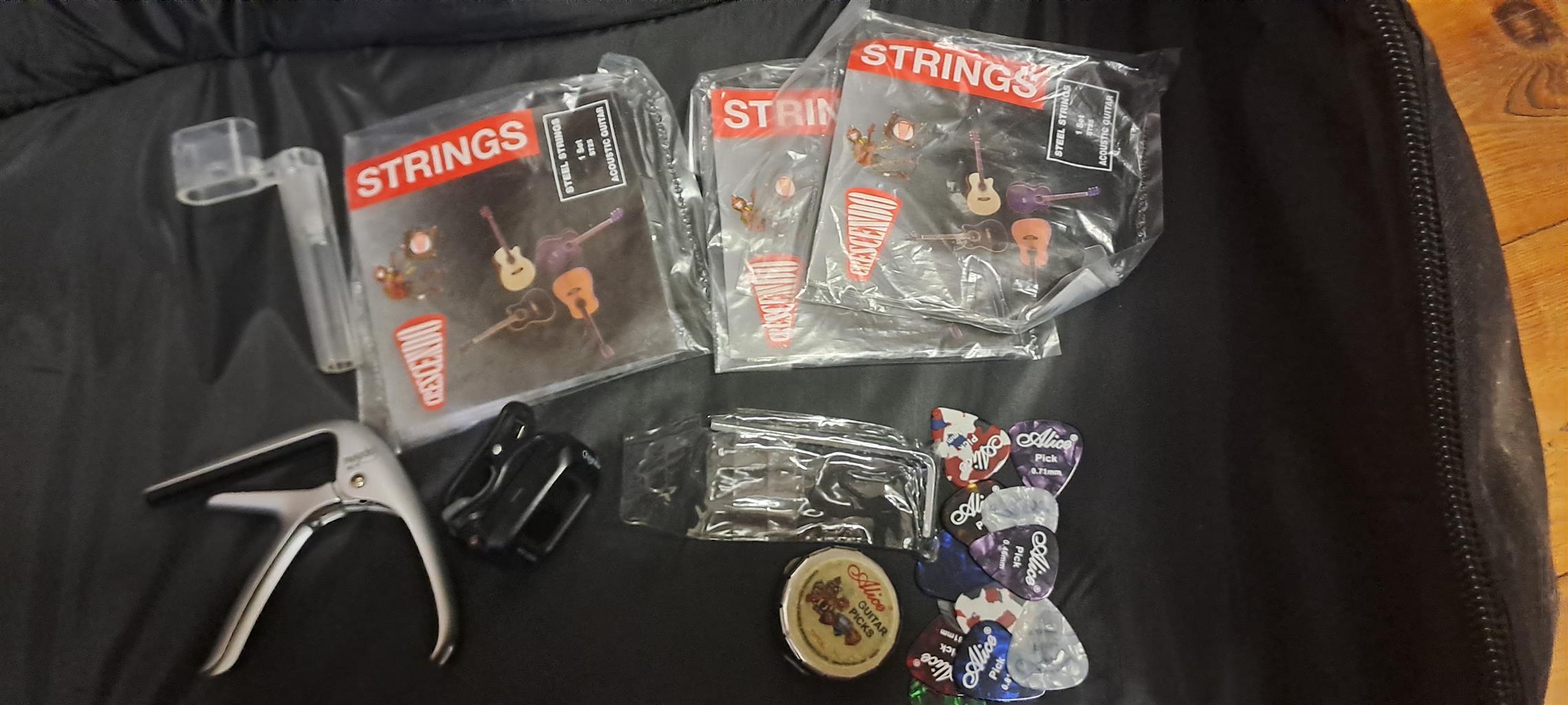 Acoustic guirar, bag, stand, x12 pics, 3 sets of brand new steal strings and tuner.