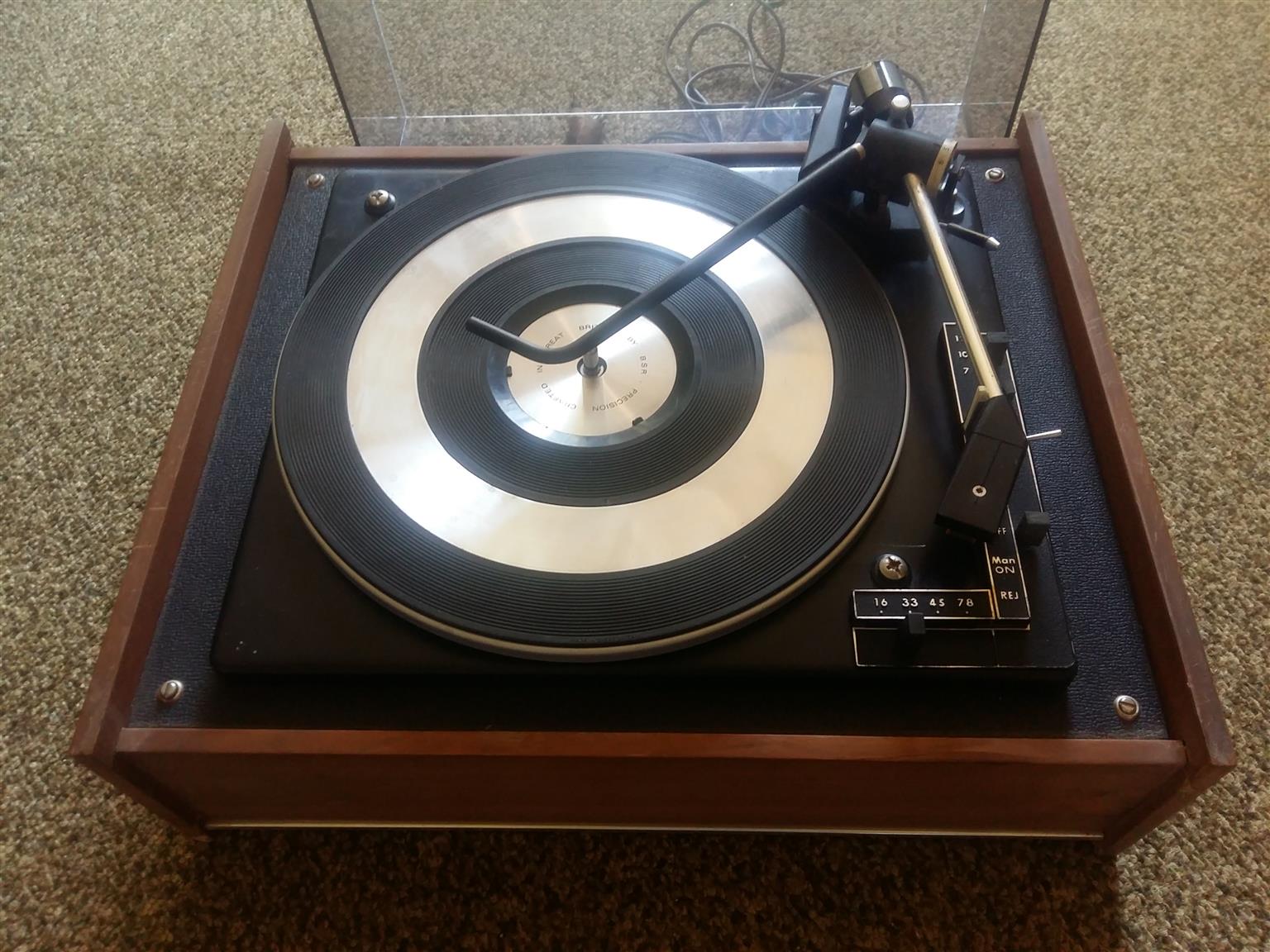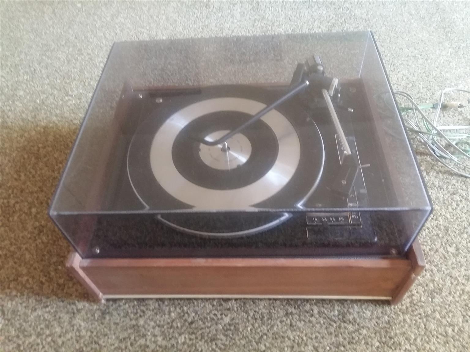 BSR Four speed stereo turntable. Slight damage to case.