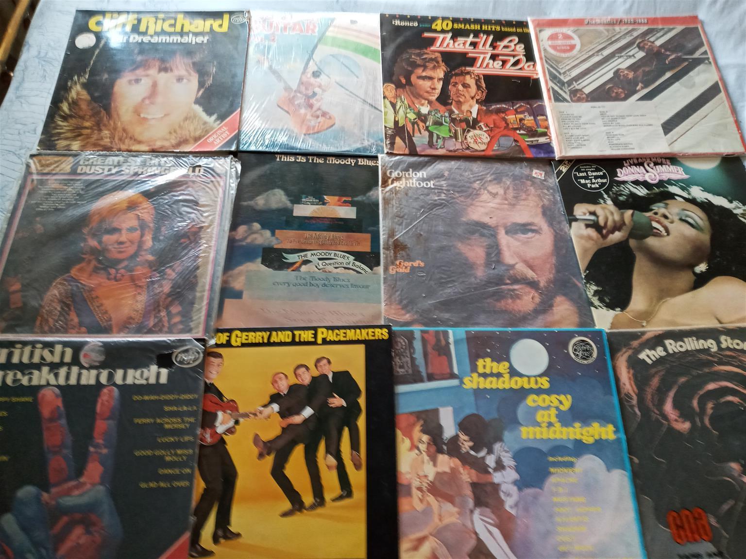 Numerous Long Playing records in outstanding condition by artist like The Beatles Limited Edition red vinyl discs double LP, The Rolling Stones Hot Rocks LP, The Shadows Cozy at Midnight double LP, This is the Moody Blues double LP, Gordon Lightfoot -Gord's Gold double LP, Live & More Donna Summer double LP, Hooked on Guitar double LP, 40 smash hits from That will be the day movie LP, Rodriguez Cold Fact original LP, John Lennon Collection LP, The greatest hits of the Walker Brothers LP, The Best of Jethro Tull LP, The Grand Funk Collection LP, The Beach Boys 20 Golden Greats LP, Dave Clark Five 25 Thumping Great Hits LP, Linda Ronstadt Get Closer LP, Commodores Nightshift LP, The Best of Bread LP, Golden hour of the Kinks LP, Cliff Richard Mr. Dream maker LP, The Best of Gary and the Pacemakers LP, Greatest Hits by Dusty Springfield LP, The Good Times by The Guys & Dolls LP, British Breakthrough LP, The Hollies Collection LP, The Best of Pussy Cat LP, High Voltage by 5000 Volts LP, The Session men Sha-Na-Na LP, Let the Thunder Cry by Jim Capaldi LP, Rhythm & Blues Explosion featuring Ike and Tina Turner and other greats LP, Songs that will Live Forever by the original artists LP, Glittering Goldies by the original artist LP, Popshop volume 18 original hits LP featuring Fleetwood Mac & Sheena Easton & John Cougar & Barry Manilow & Peter Sarstedt & Dion Warwick& Chicago LP, The Thymes with Turning Point LP, Malie Kelly Collection LP.