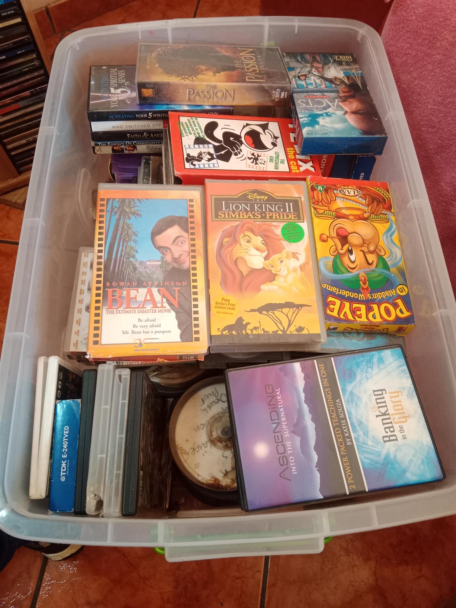 Large lot of dvds and cds and vhs tapes and still in good condition. Mostly copies and also originals Make me an offer