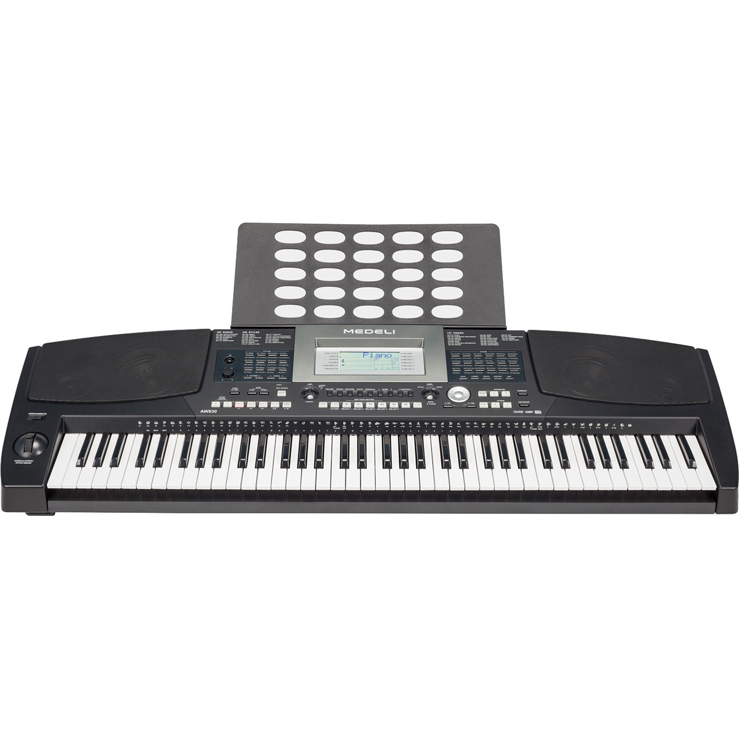 Medeli AW830 is a 76 key touch sensitive keyboard which is great for music enthusiasts and performers alike. It is equiped with 787 voices including 50 user voices, 240 preset styles and 128 polyphony. With Performance Assistant, playing the keyboard becomes more interesting as it provides many beautiful phrases to enrich your performance. You can then save the performance on USB host slot and save it on your computer.