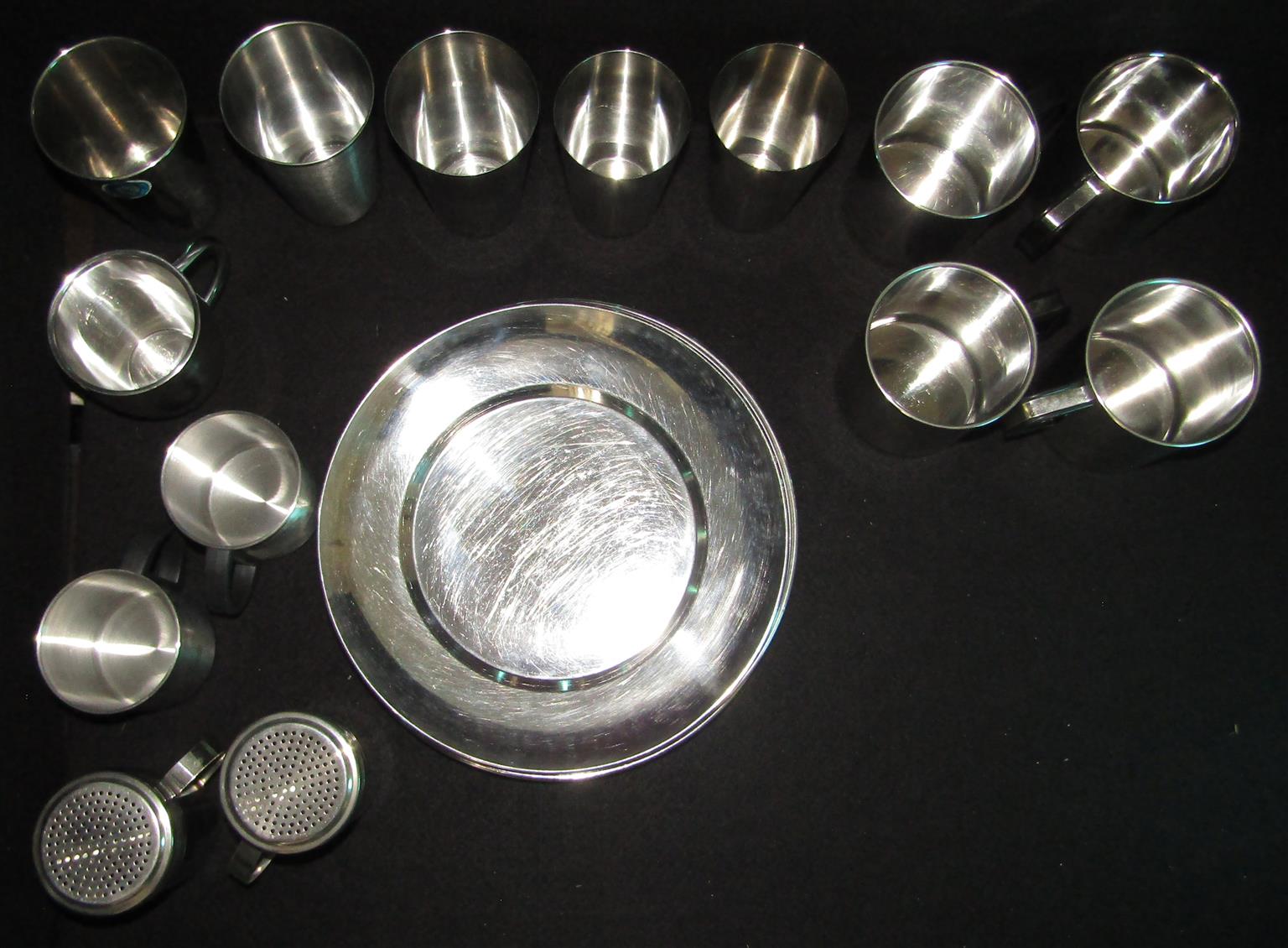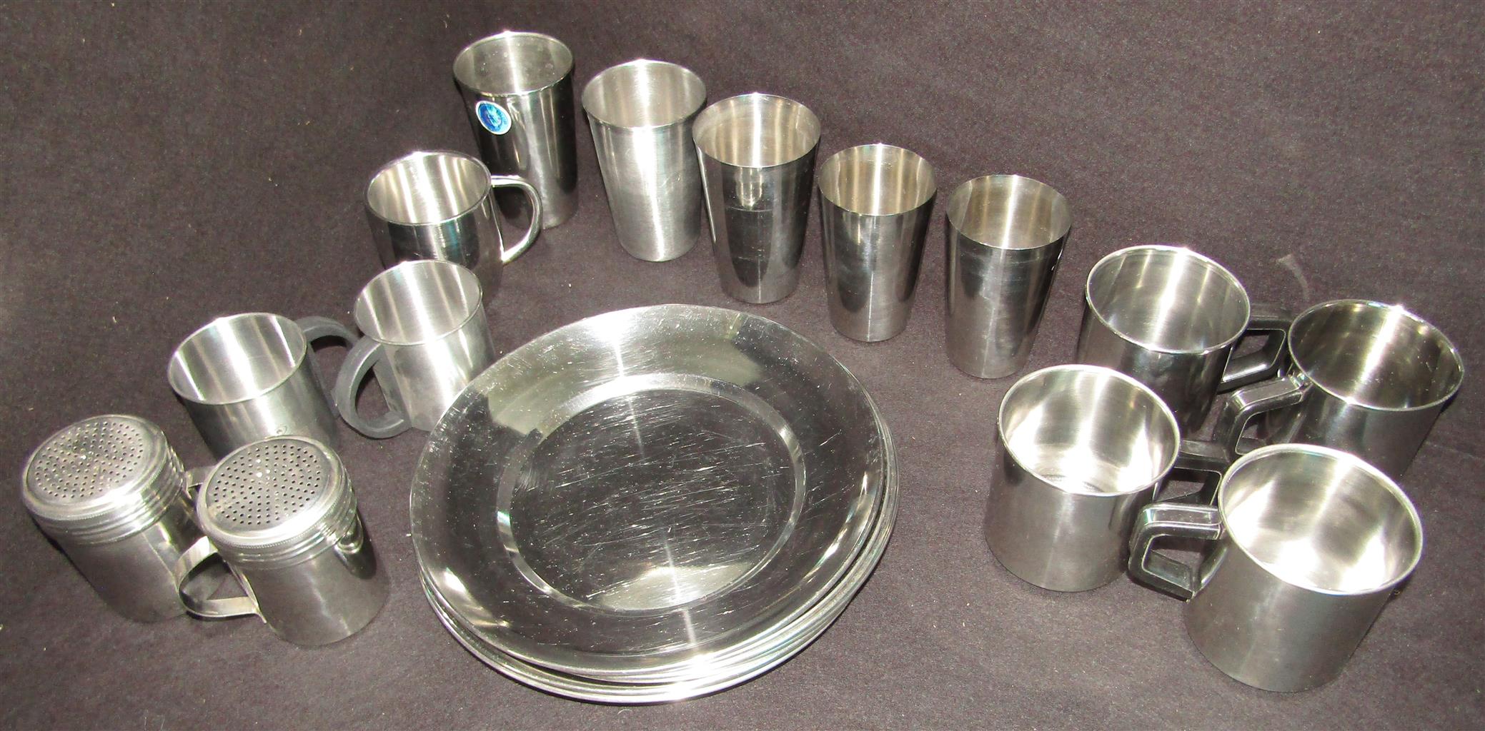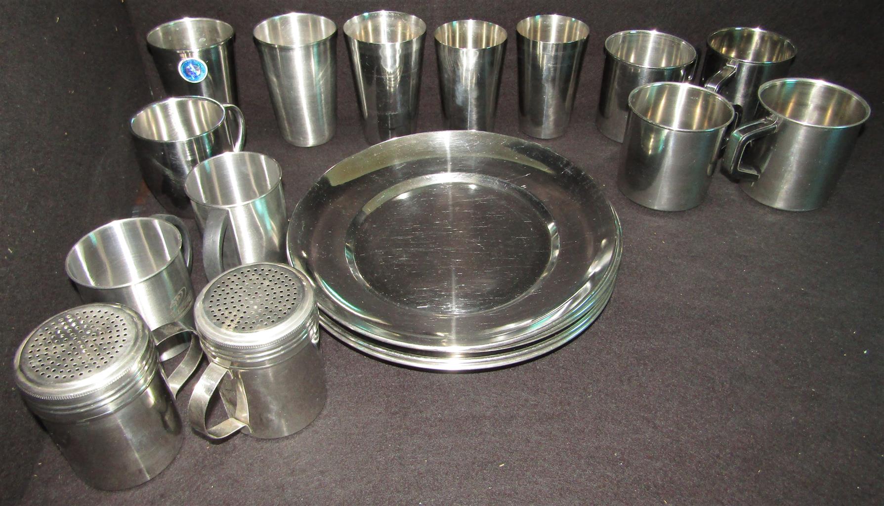 Approximate dimensions: 8 x Plates d=26cm; 4 x Double Skinned Mugs d=94mm; h=95mm; 2 x Puregas Mugs d=74mm; h=82mm; 2 x Spice Shakers d=70mm; h=100mm; 1 x Mug d=81mm; h=90mm; 2 x Drinking Glasses d=73mm; h=115mm; 3 x Drinking Glasses d=80mm; h=122mm. Everything, including the Glasses, is made from Stainless Steel.