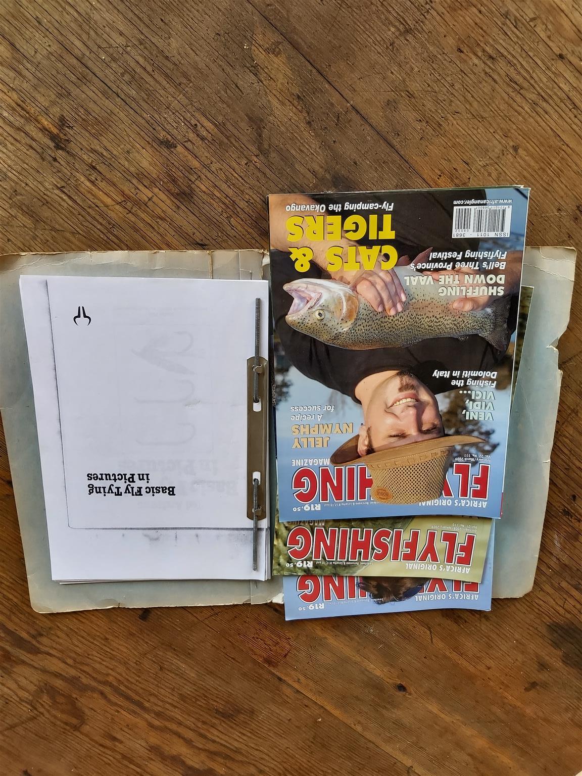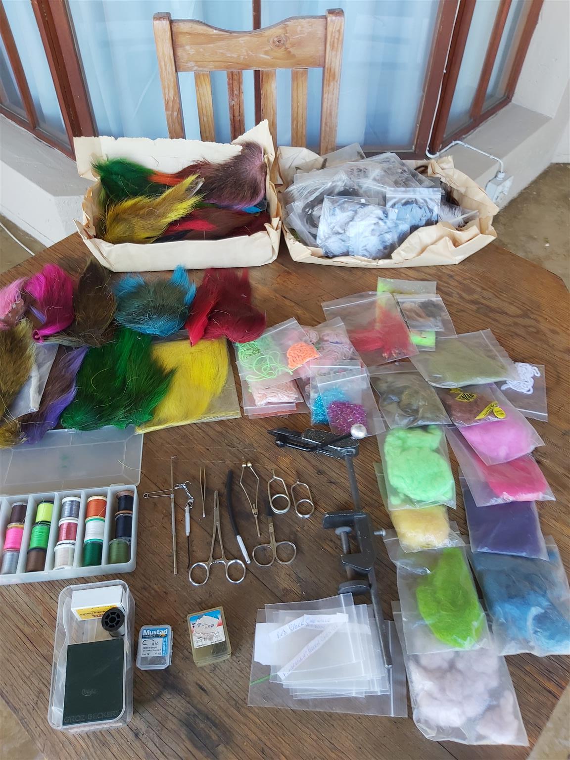 Fly tying materials, including feathers, deer hair, dubbing, threads, full tool set with vice, basic tutorial and 30 magazines.