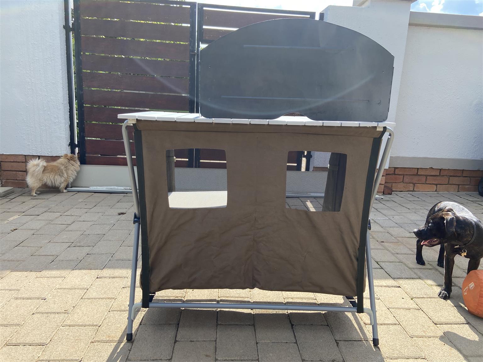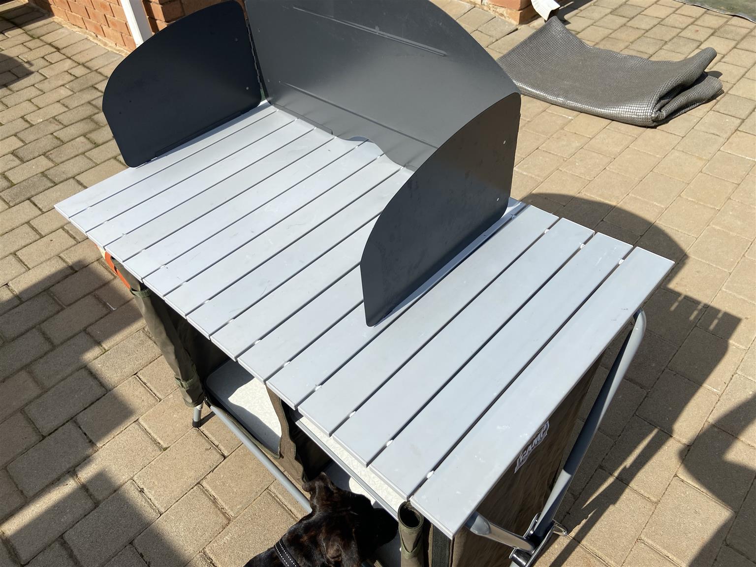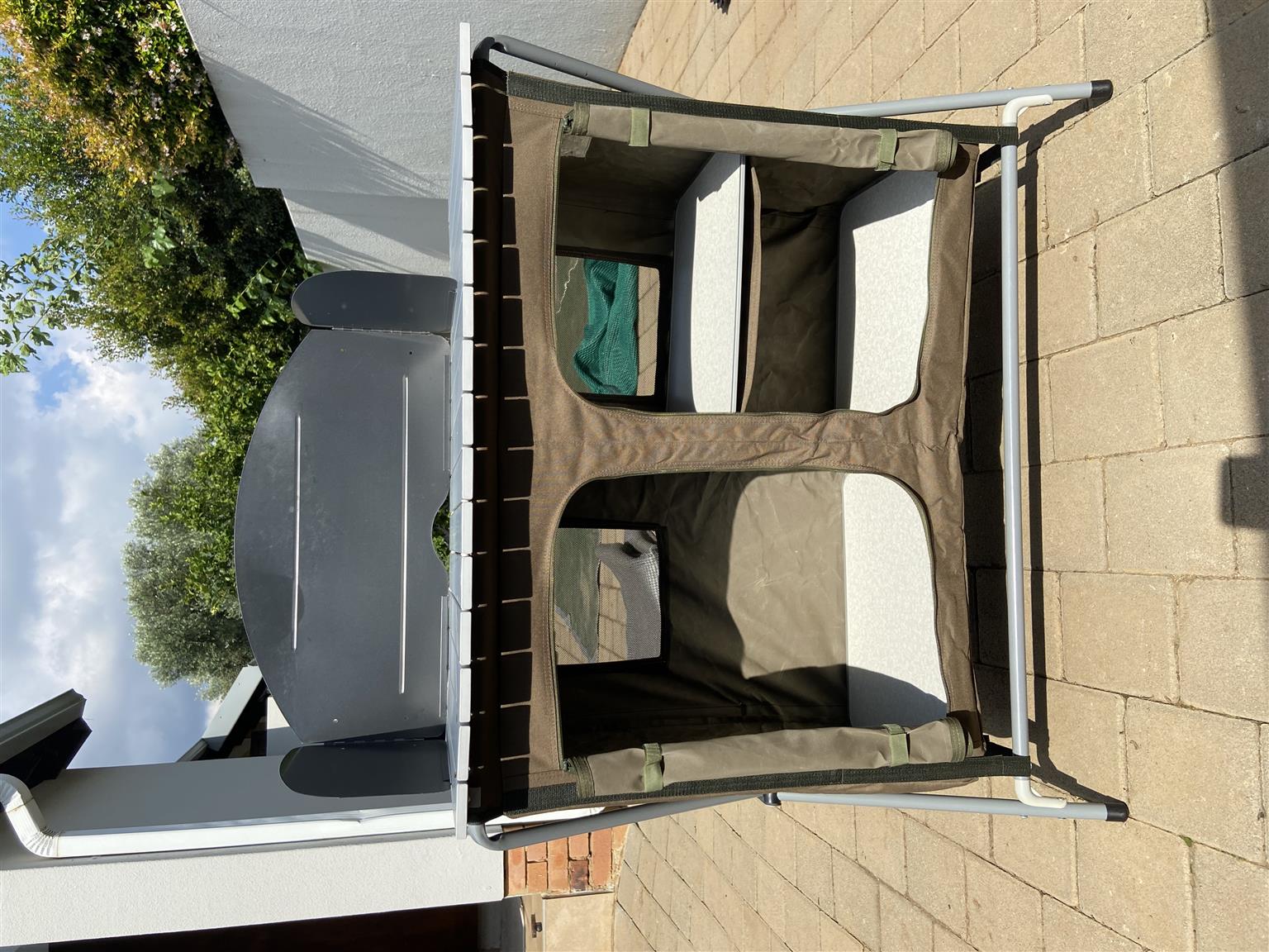 Camping Kitchen Cupboard.Folds up into handy carry bag.Has 2 zip up doors.One side has 2 sturdy shelves.