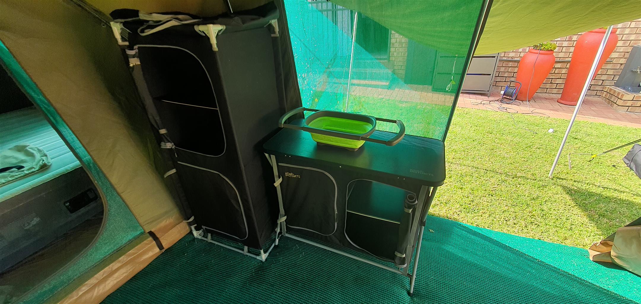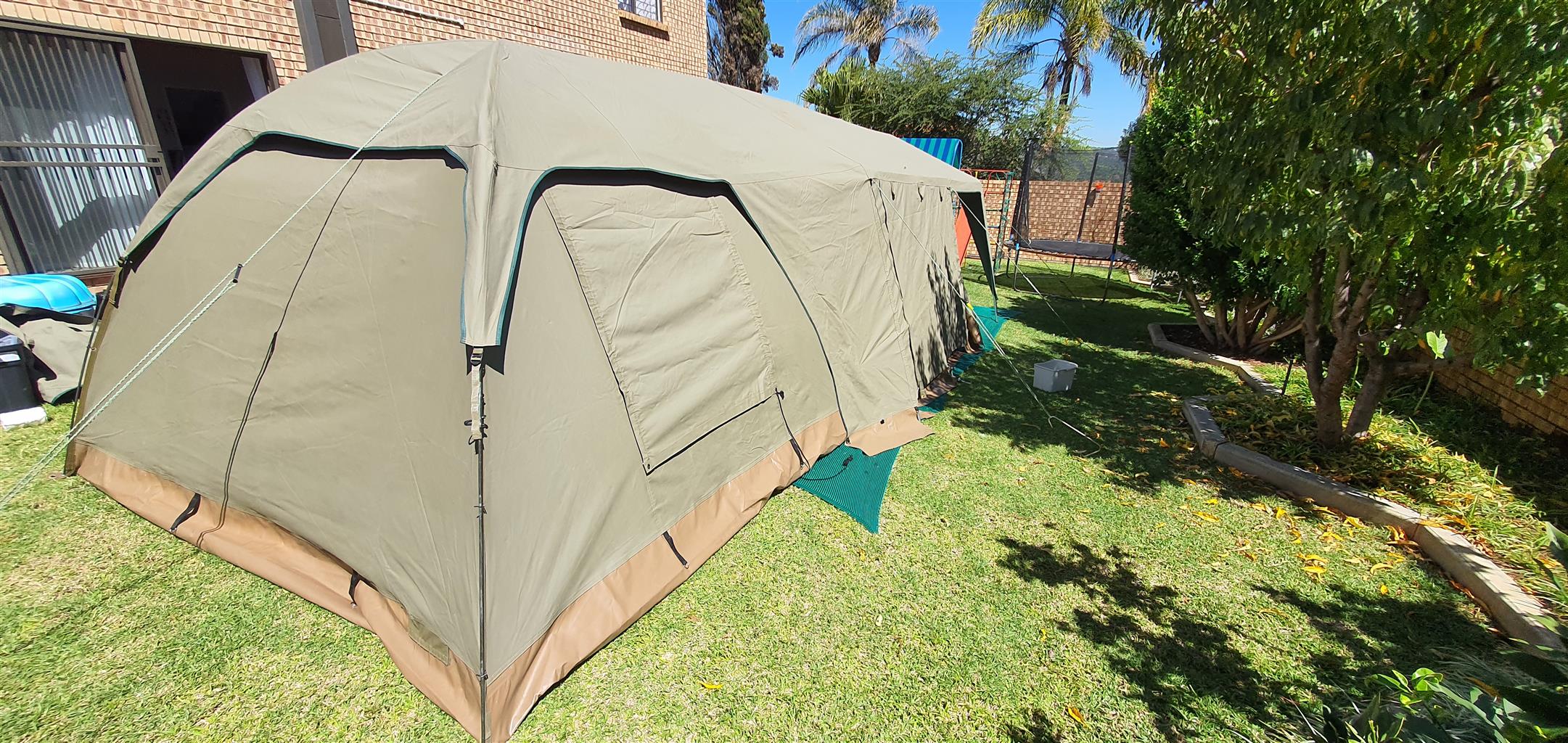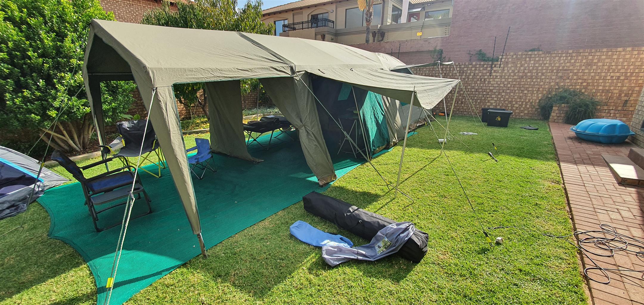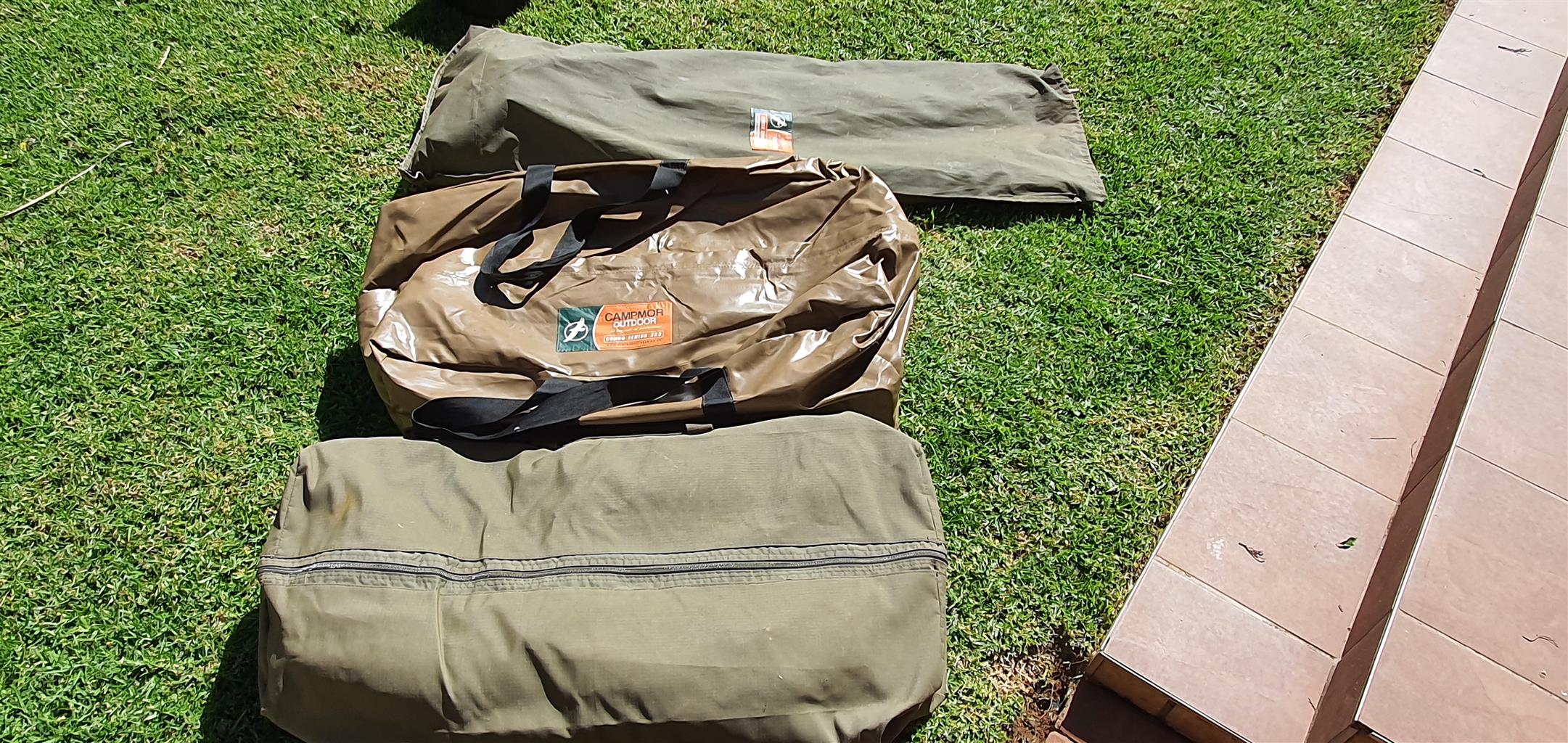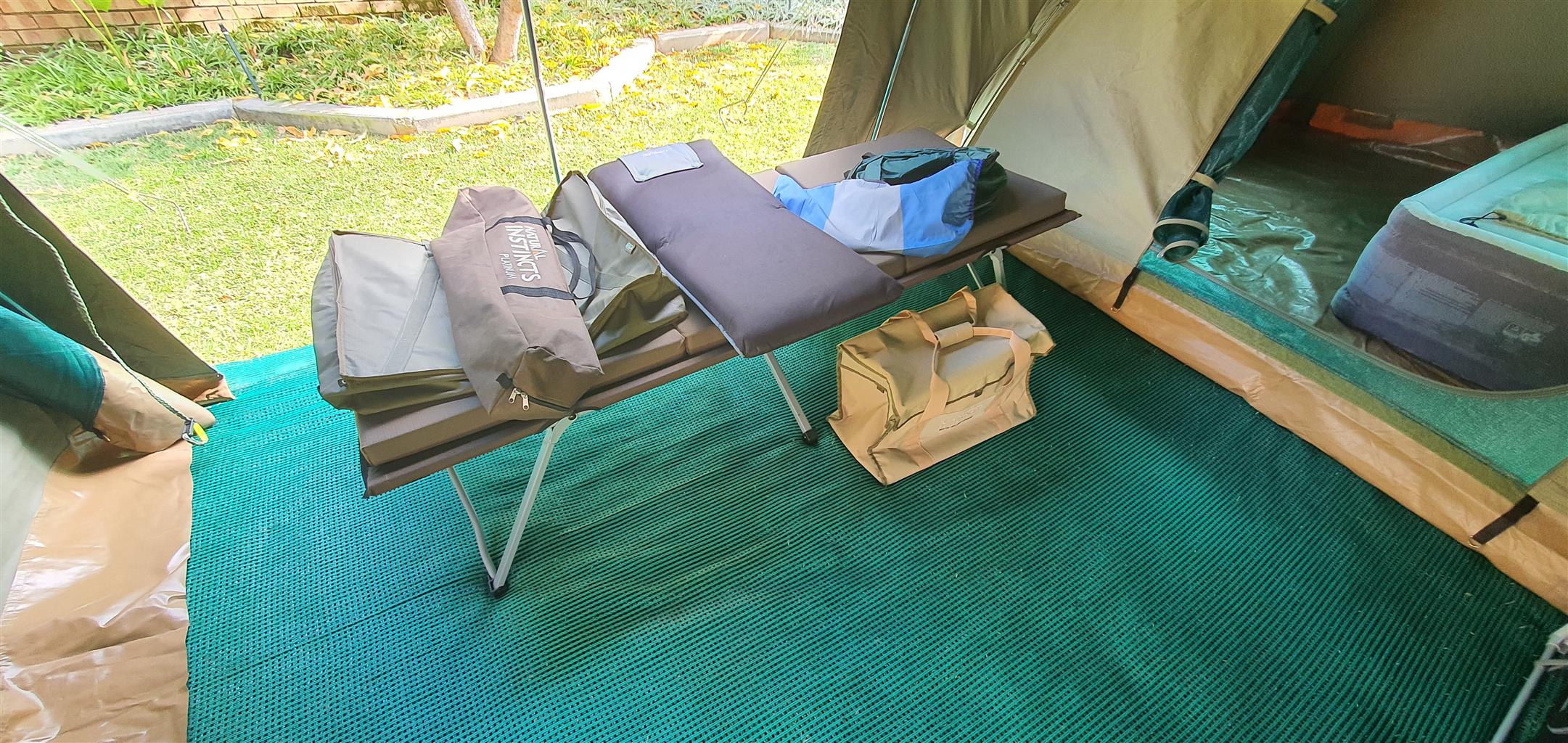 One Bushtech 3mx3m Dome in very good condition, a Campmor Safari bush combo, Camp master camp dome 200 kids tent, Intek Queensize inflatable bed, Heavy-duty strecher and folding mattress, one Disco bed stacker, inflatable mattress. Natural instincts 4 tier cubart, 4 shelf folding cubard, chairs, ropes, storm cables, tent pegs, flexible hose, electrical cable and other accessories. More pictures are available on request.