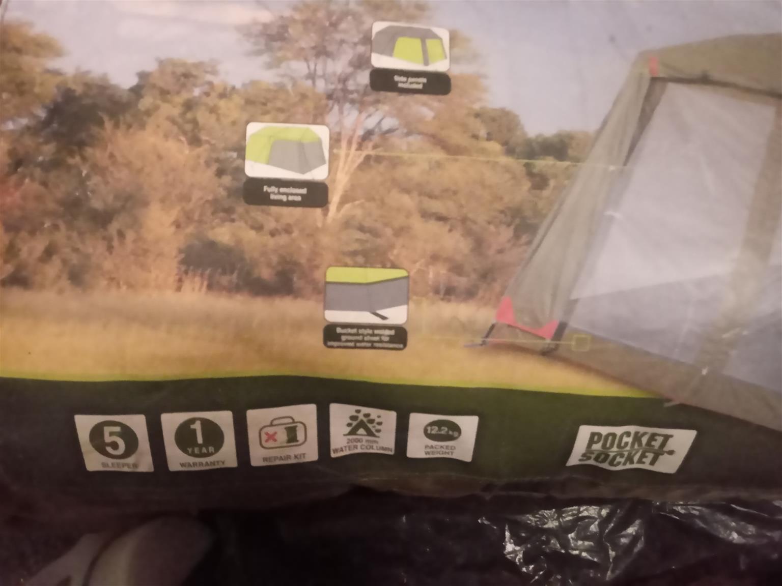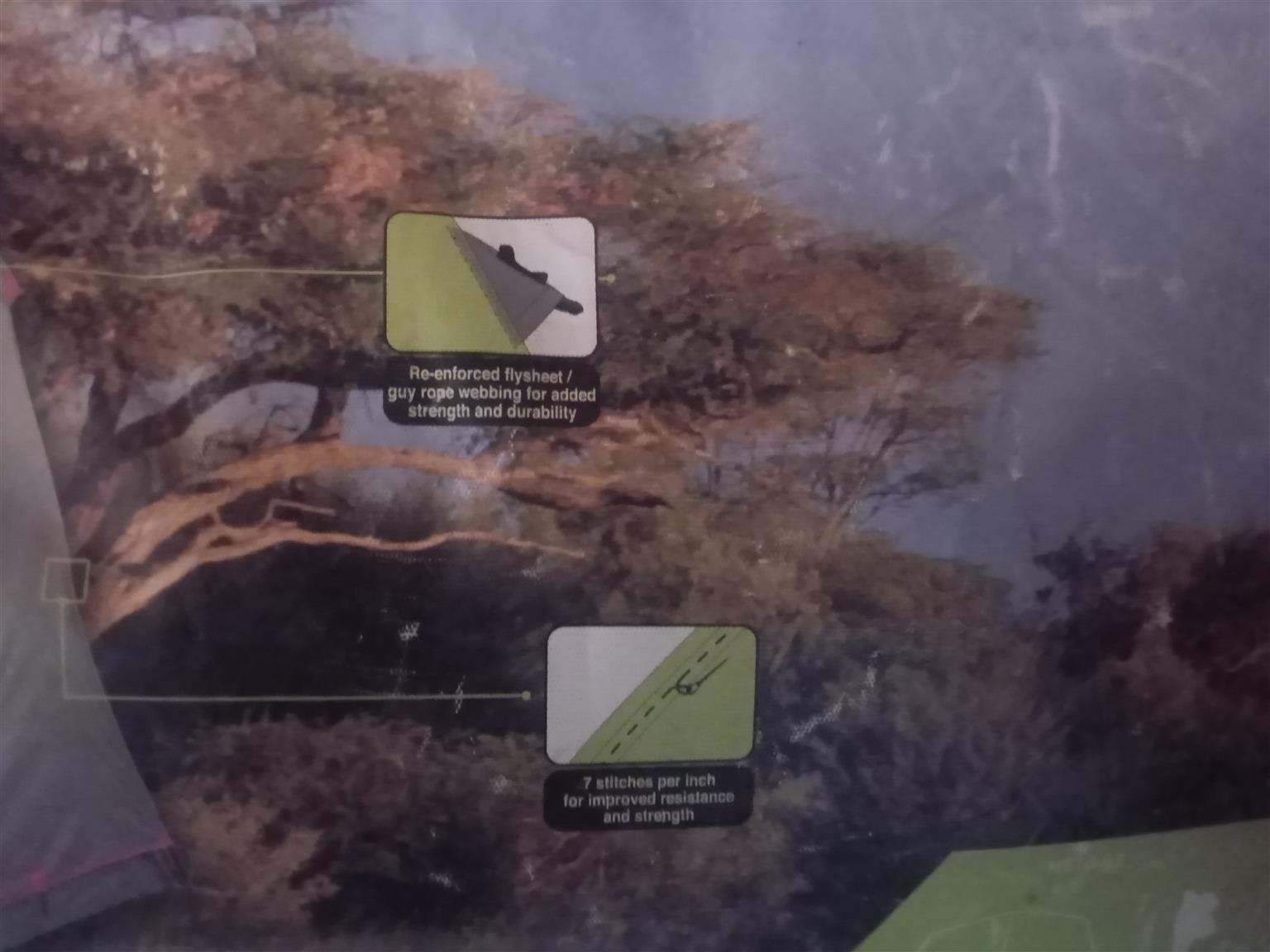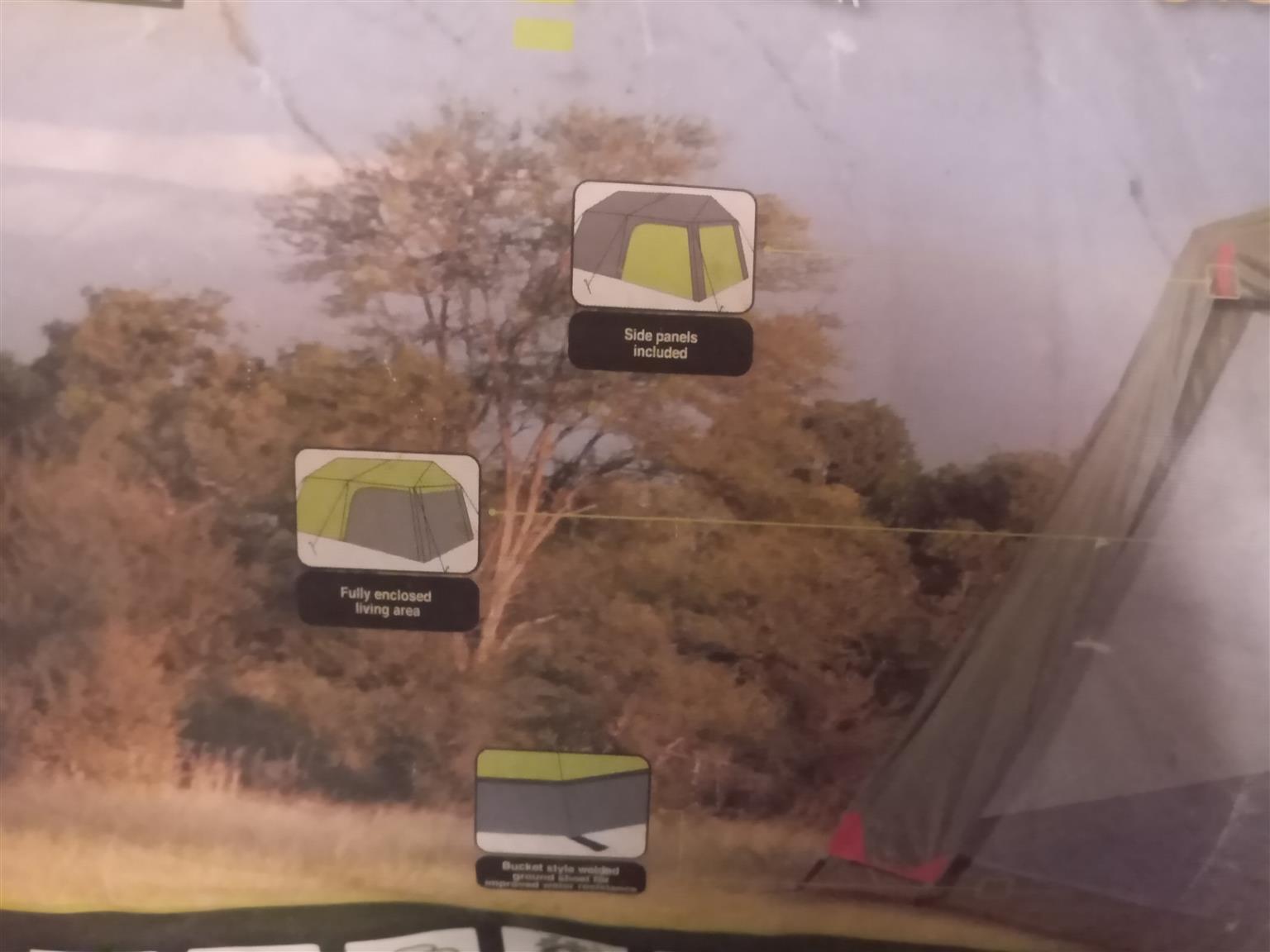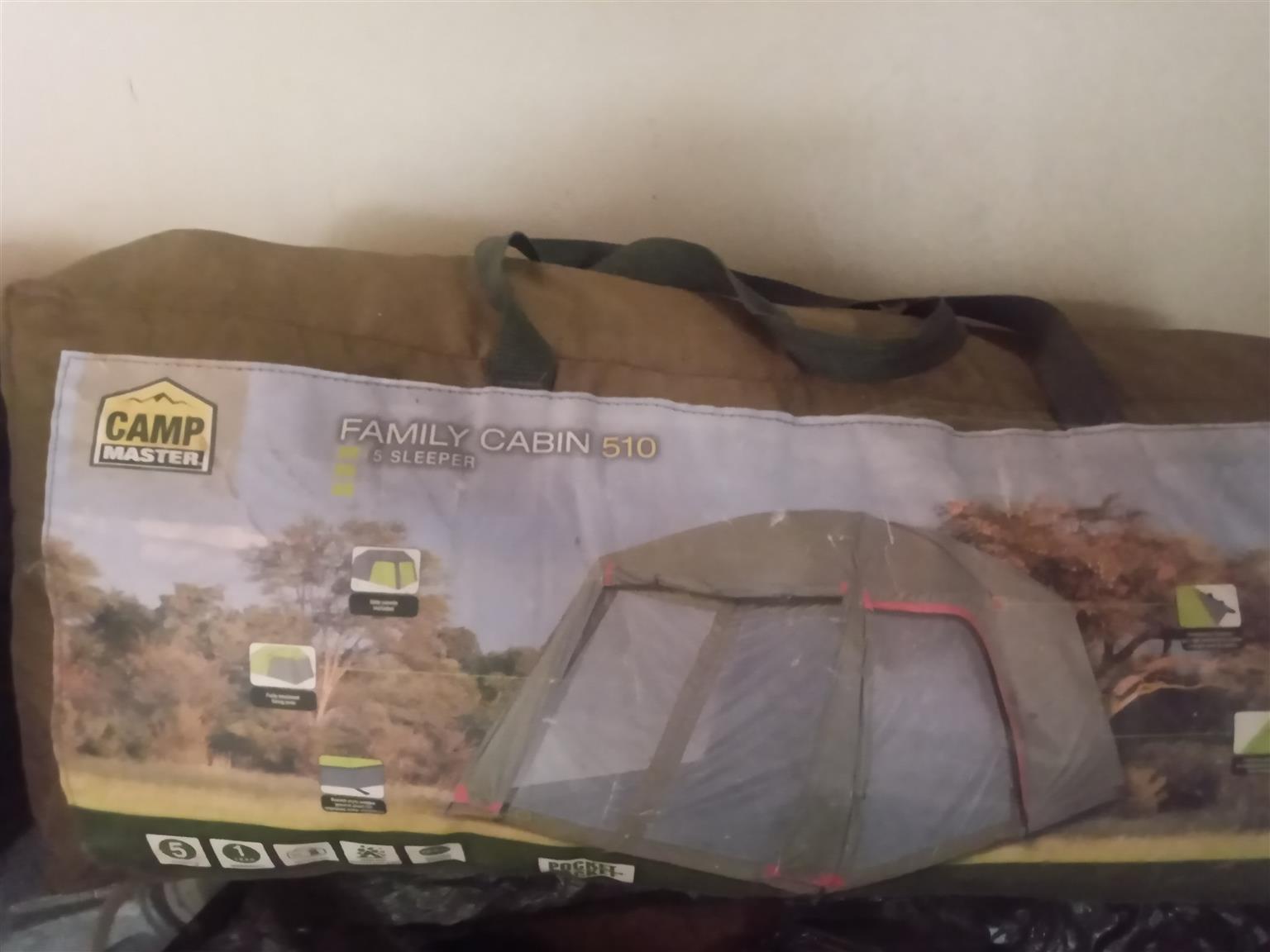 Family Cabin 510 5 Sleeper Camp Master Tent, Side panels included with fully enclosed living area, reinforced flysheet for added strength. only used 3 times since bought but still looks new. The reason for selling is looking for canvas tent.