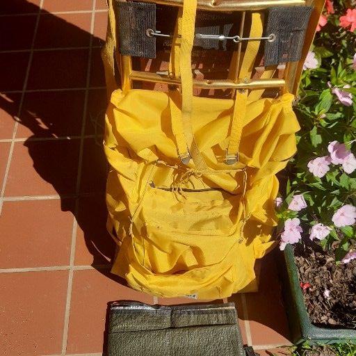 Large framed nylon rucksack with many pockets & accessories for hikers. New condition