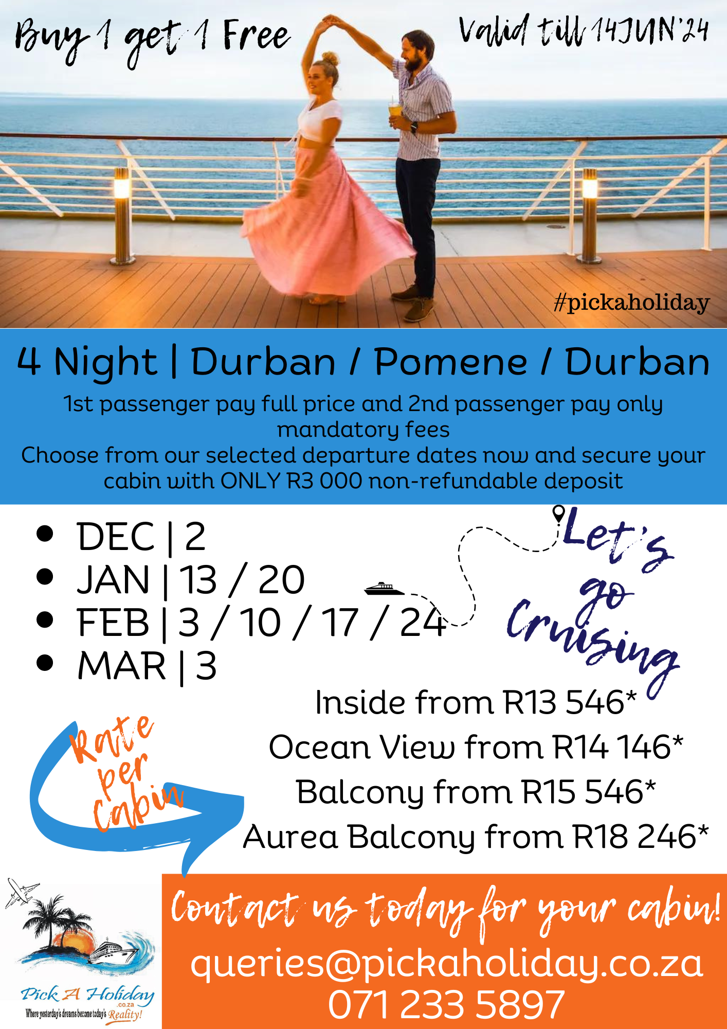 Select your cruise date today and only secure your cabin with a R3 000 non-refundable deposit