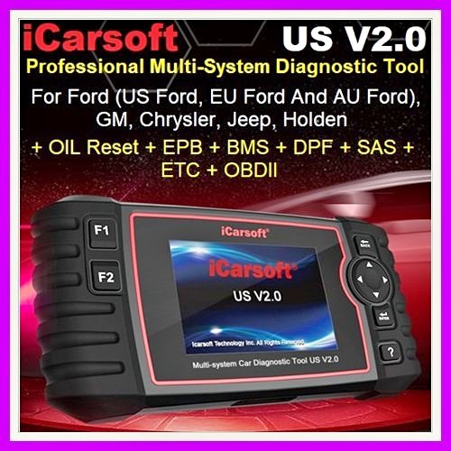 Professional Multi-System Diagnostic Tool US V2.0 For Ford (US Ford, EU Ford And AU Ford), GM, Chrysler, Jeep, Holden PRODUCT FEATURES 1.iCarsoft US V2.0 can do it all-reads and clears trouble codes on most of the systems such as engine, transmission, ABS and airbag etc. 2.Support OBDII/EOBD Ten Modes of Operation 3.Read Live Data 4.Full ECU Diagnosis 5.Applies to the single Brand of most of the Models which equipped with OBDII-16 DLC 6.Easy To Use With Silicone Keys 7.Oil Light/Service Reset: Support service lamp reset. 8.Electronic Parking Brake (EPB) system maintenance deactivates and reactivates the EPB system for replacement and initialization. 9.Battery Management System (BMS), registers new battery to the BMS while battery replacement. 10.Diesel Particulate Filter (DPF) regeneration control system, requests the DPF regeneration process while DPF blockage and turn off the DPF indicator. 11.Electronic Throttle Control systems (ETC) relearn the throttle valve control value while clear or replace the throttle valve. 12.SAS: Steering Angle Sensor (SAS) calibration, calibrates the steering wheel to straight ahead, or recalibrates SAS while steering part replacement. 13.The Print Data function allows you printing out diagnostic data recorded by the scan tool or customized test reports. 14.Battery test allows you getting the voltage of battery with OBD port by the scan tool when the engine starts. 15.DTC Library to lookup when user is operating this tool. 16.Upgrade via PC. 17.Multi-language: English, German, Dutch, Spanish, French. FIFTEEN SUPER ADVANTAGES Diagnose Single Brand of most Models (OBDII-16DLC) Full System Diagnosis Support Oil Service Reset Electronic Parking Brake (EPB) system maintenance Battery Management System (BMS) Diesel Particulate Filter (DPF) Regeneration Control System Electronic Throttle Control System (ETC) Steering Angle Sensor (SAS) Calibration Read&Clear DTC Read Live Date Support Battery Test Support Data Review and Print Full Speed Upgrade via PC 4.0″ TFT LCD, 480*320 Pixels Support Multi-Language OBDII FUNCTION 1. Read Codes 2. Erase Codes 3. I/M Readiness -- I/M Readiness indicate whether or not the various emissions-related systems on the vehicle are operating properly and are ready for Inspection and Maintenance testing. 4. Data stream. 5. Freeze Frame -- When an emission-related fault occurs, certain vehicle conditions are recorded by the on-board computer. This information is referred to as freeze frame data. Freeze Data is a snapshot of the operating conditions at the time of an emission-related fault. 6. O2 Sensor Test -- This option allows retrieval and viewing of O2 sensor test results for most recently performed tests from the vehicle's on-board computer. 7. On-Board Monitoring -- This function can be utilized to read the results of on-board diagnostic monitoring tests for specific components/systems. 8. Evap System Test -- The EVAP test function lets you initiate a leak test for the vehicle's EVAP system. Before using the system test function, refer to the vehicle's service repair manual to determine the procedures necessary to stop the test. 9. Vehicle Information -- The option displays the vehicle identification number (VIN), the calibration verification number (CVN), and other information of the test vehicle. 10. Retrieve generic (P0, P2, P3, and U0), manufacturer specific (P1, P3, and U1) codes and pending codes 11.Turn off Check Engine Light (MIL), clear codes and reset monitors 12. Read live PCM DataStream 13. Support CAN (Controller Area Network) and all other 14. Multilingual menu and DTC definitions- English, Spanish, and German, etc 15. Read pending DTCs 16. Read permanent DTCs 17. DTCs search 18. Supports most of the OBDII/EOBD test modes include: CAN, ISO9141, KWP2000, J1850 VPW and J1850 PWM. 19. Works on most of 2001 and later OBDII compliant PETROL European vehicles 20. Works on most of 2004 and later OBDII compliant DIESEL European vehicles 21. Works on most of 1996 and later OBDII compliant US and Asian vehicles 22. View & Graph Live Data in Color Graphing and blazing fast refresh rate for better graphing and live data readings. 23. Comprehensive Help, Including OBD Parameter, Mode Explanations & More