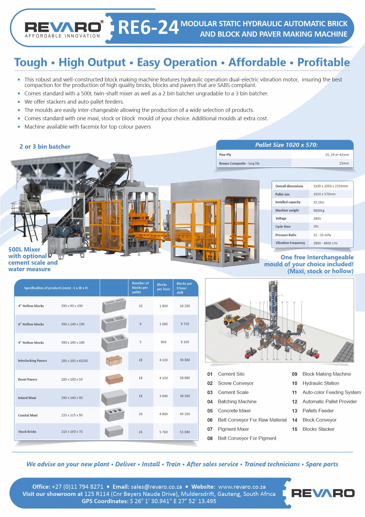 REvaro RE6-22 isa fully automatic brick block and pave making machine Comes with batcher, 500 litre miixer, stackerand pallet supply 2500x1100x570 pallets
