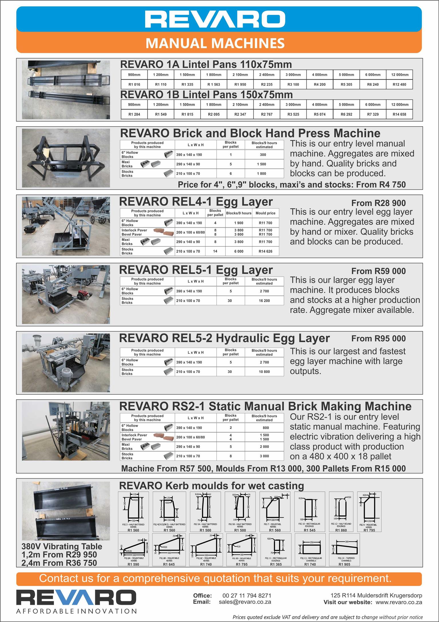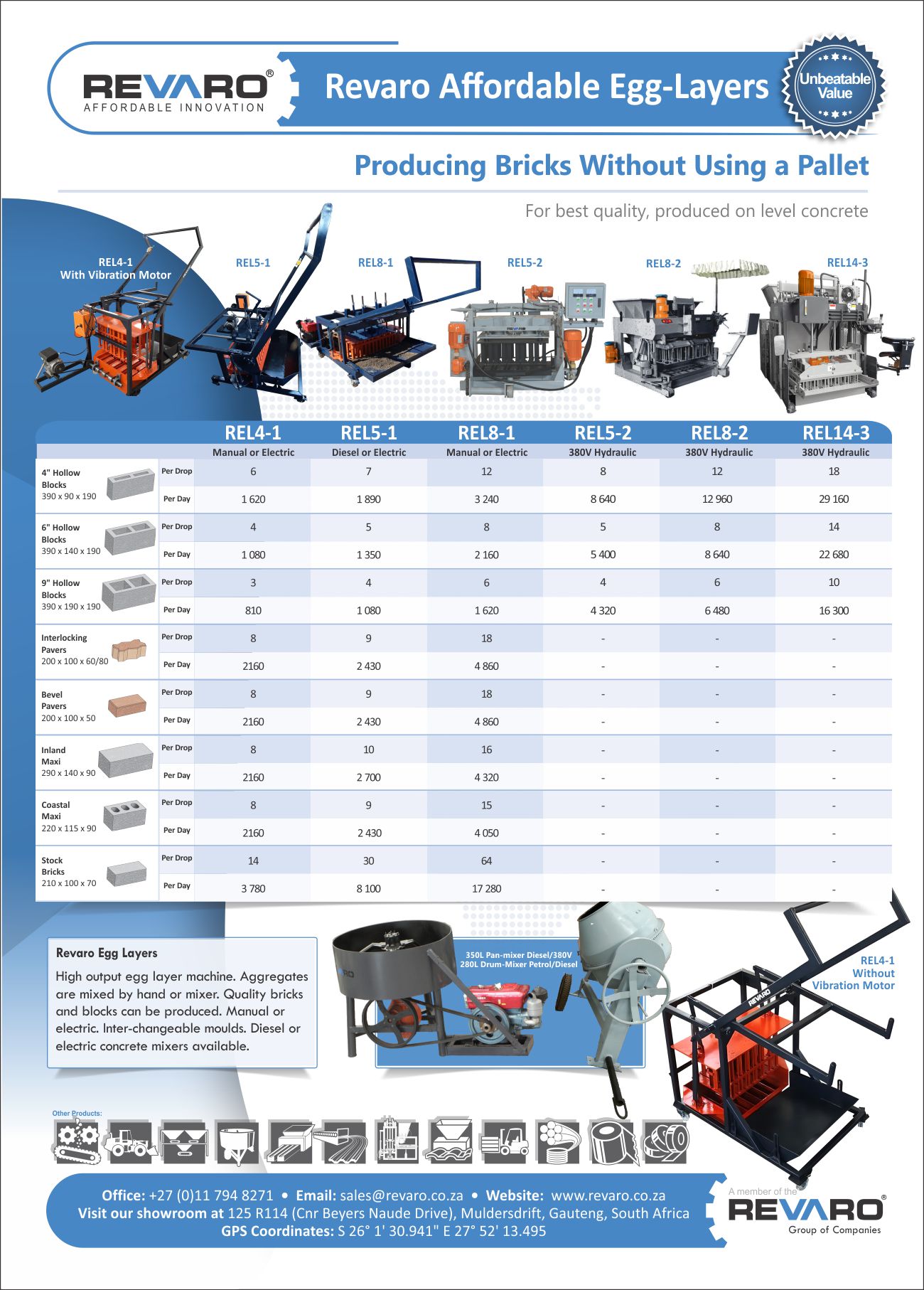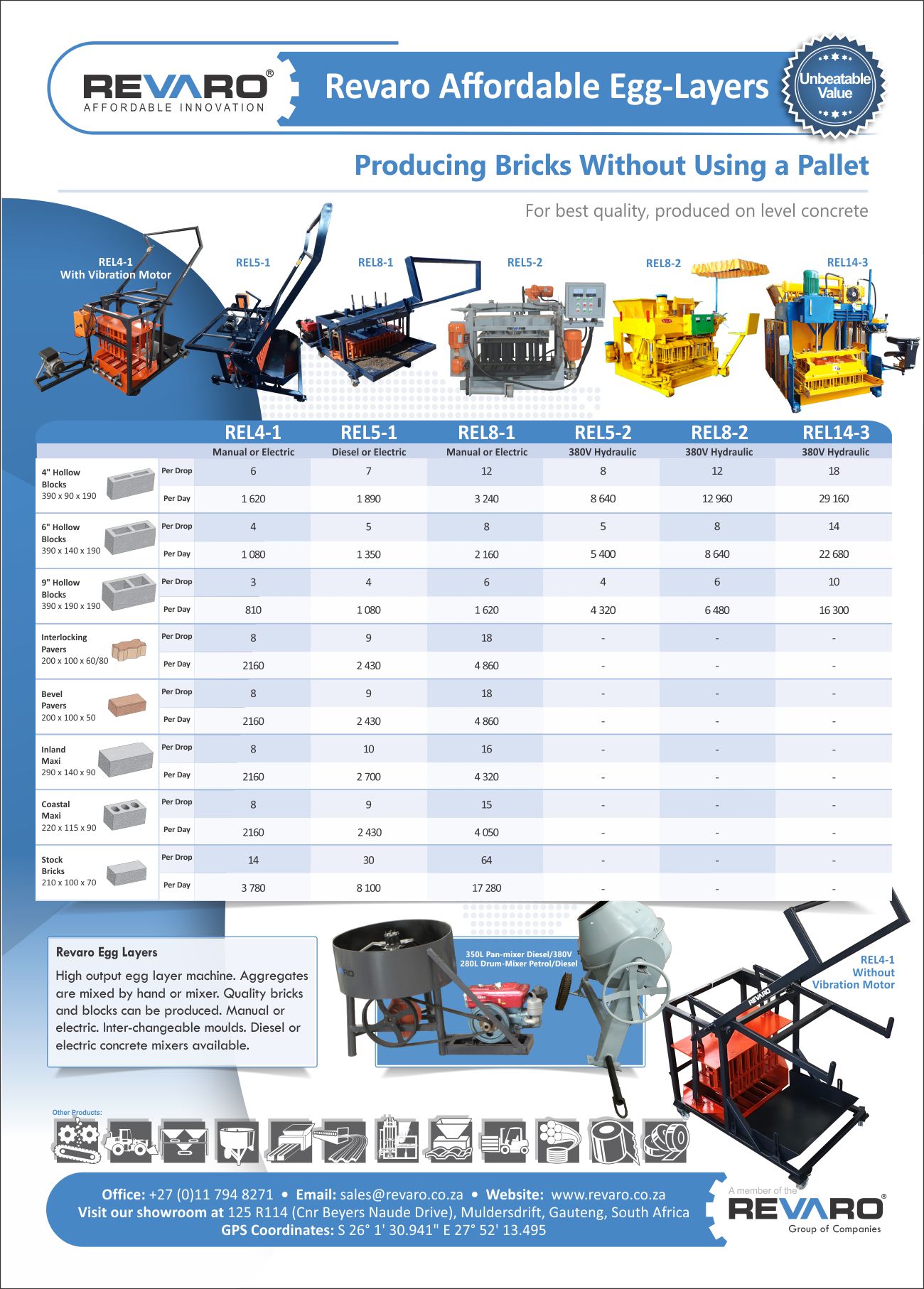 Revaro offers the largest range high quality high output egg layers in Southern Africa State of the art in 220 and 380 volt Also diesel engines Best vibration Machines with interchangeable moulds Speak to me Wilhelm on 082 566 2332view more for professional advice