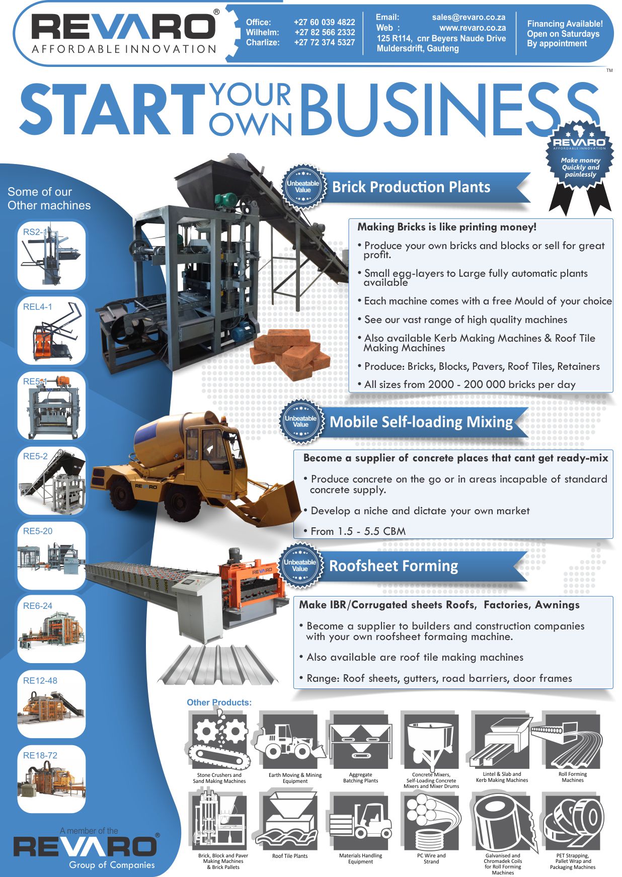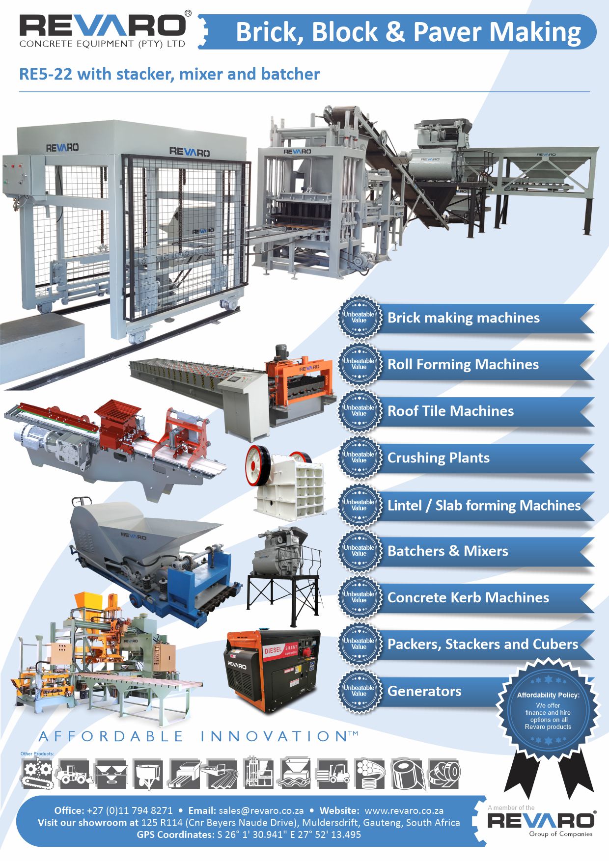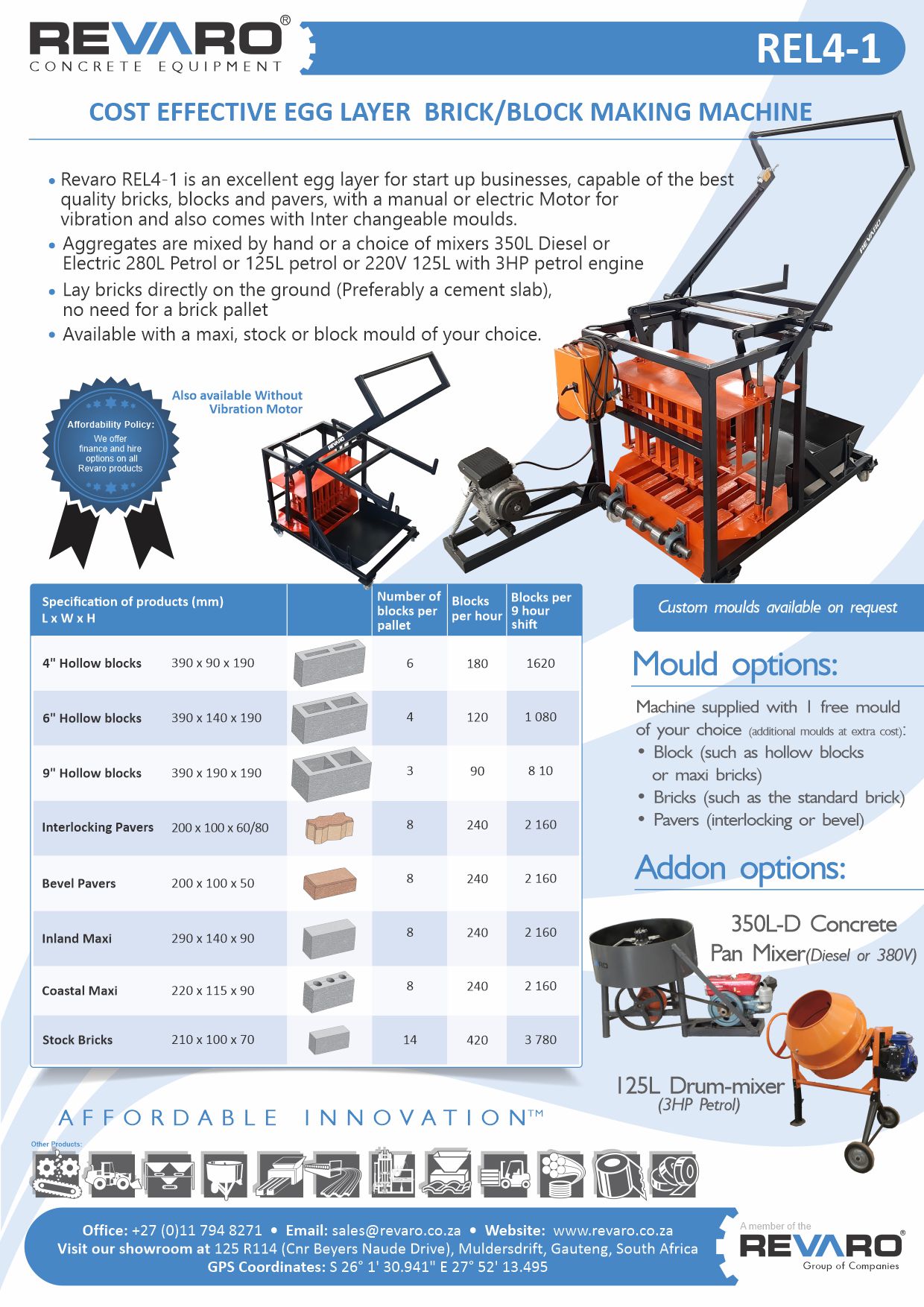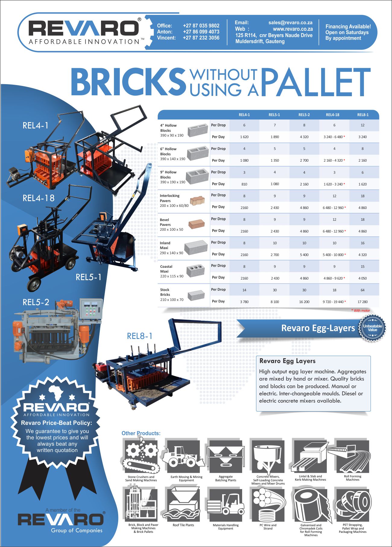 Revaro offers the largest range high quality high output egg layers in Southern Africa State of the art in 220 and 380 volt Also diesel engines Best vibration Machines with interchangeable moulds Speak to me Wilhelm on 082 566 2332view more for professional advice