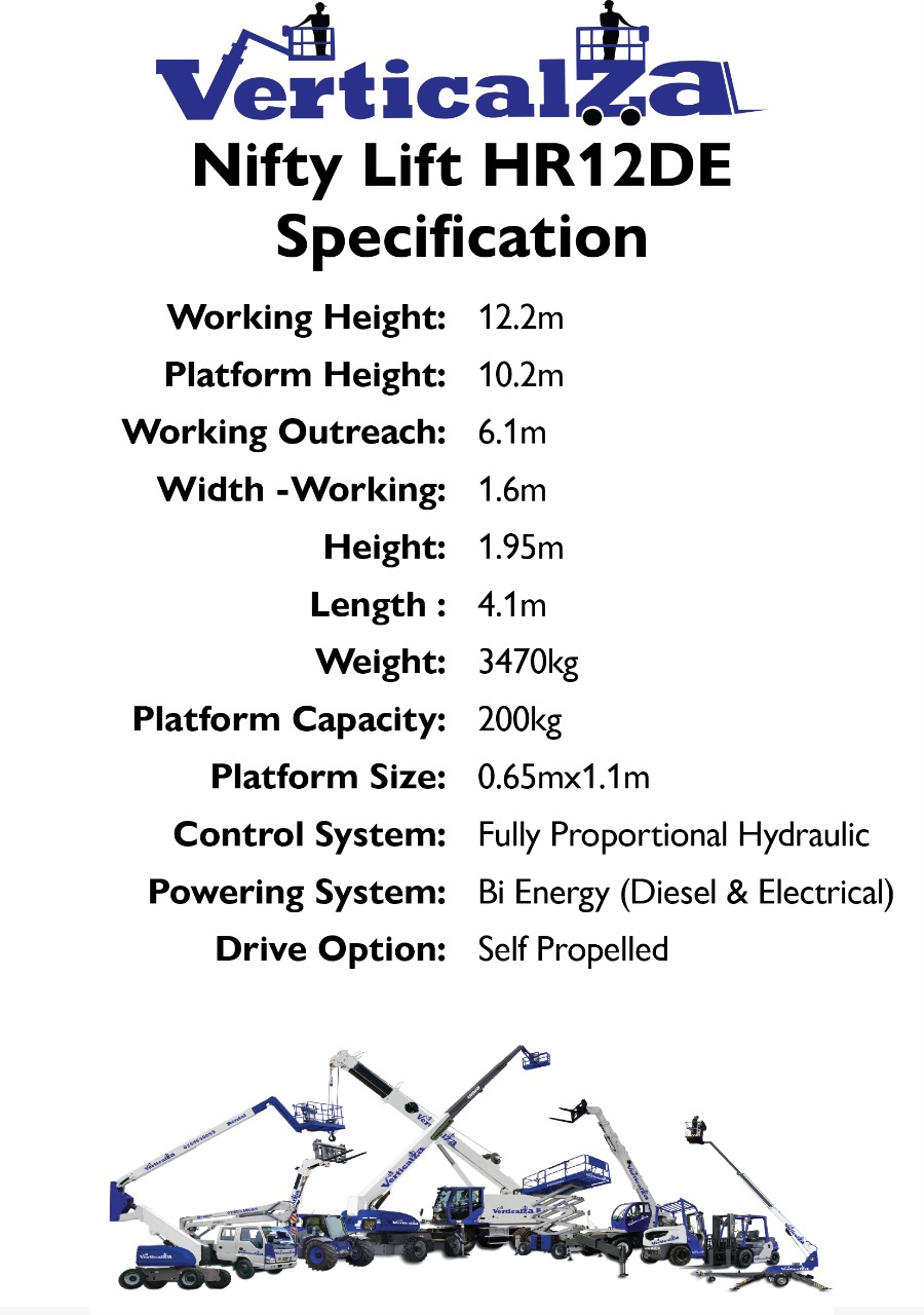 VerticalZA - Nifty HR12DE Electrical/Diesel Articulated Boom Lift / Cherry Picker, Reaches 12 Meters. Ideal for work such as vinyl application, painting, construction, all repair work at height, plumbing for flat blocks, installing lighting inside large halls or factories etc. For Rent on Daily/ Weekly/ Monthly Basis. Call: 076-553-0053view more or visit VerticalZA on our website www.verticalza.co.za