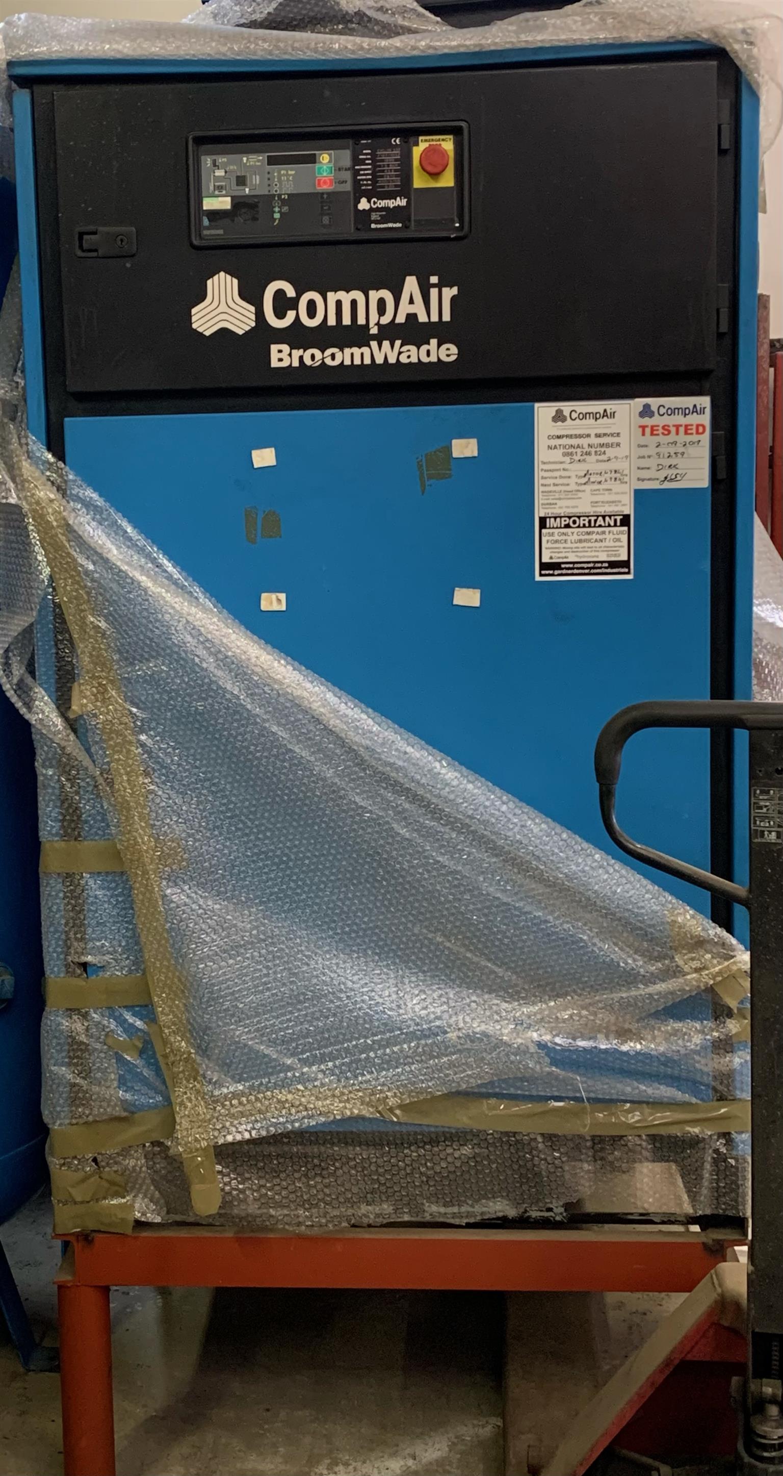 pulleys fitted to the shafts of the drive motor and air-end.The compressor unit consists of the drive motor, air-end, oil separator vessel, oil separator filter, oil cooler, aftercooler, cooling fan, starter assembly and controller. The complete compressor unit is mounted on a baseframe and is housed in a steel panelled acoustic enclosure. A service panel allows access for routine maintenance