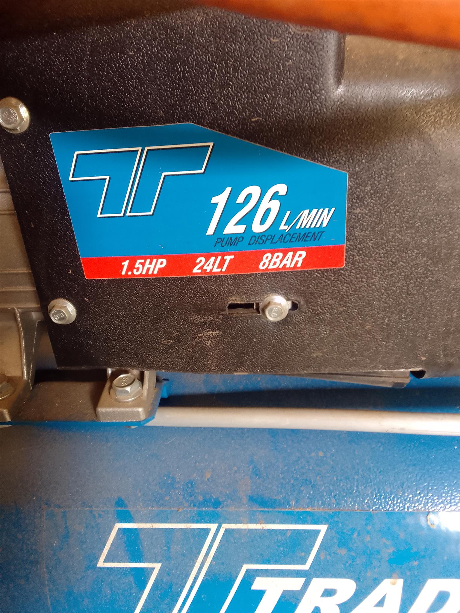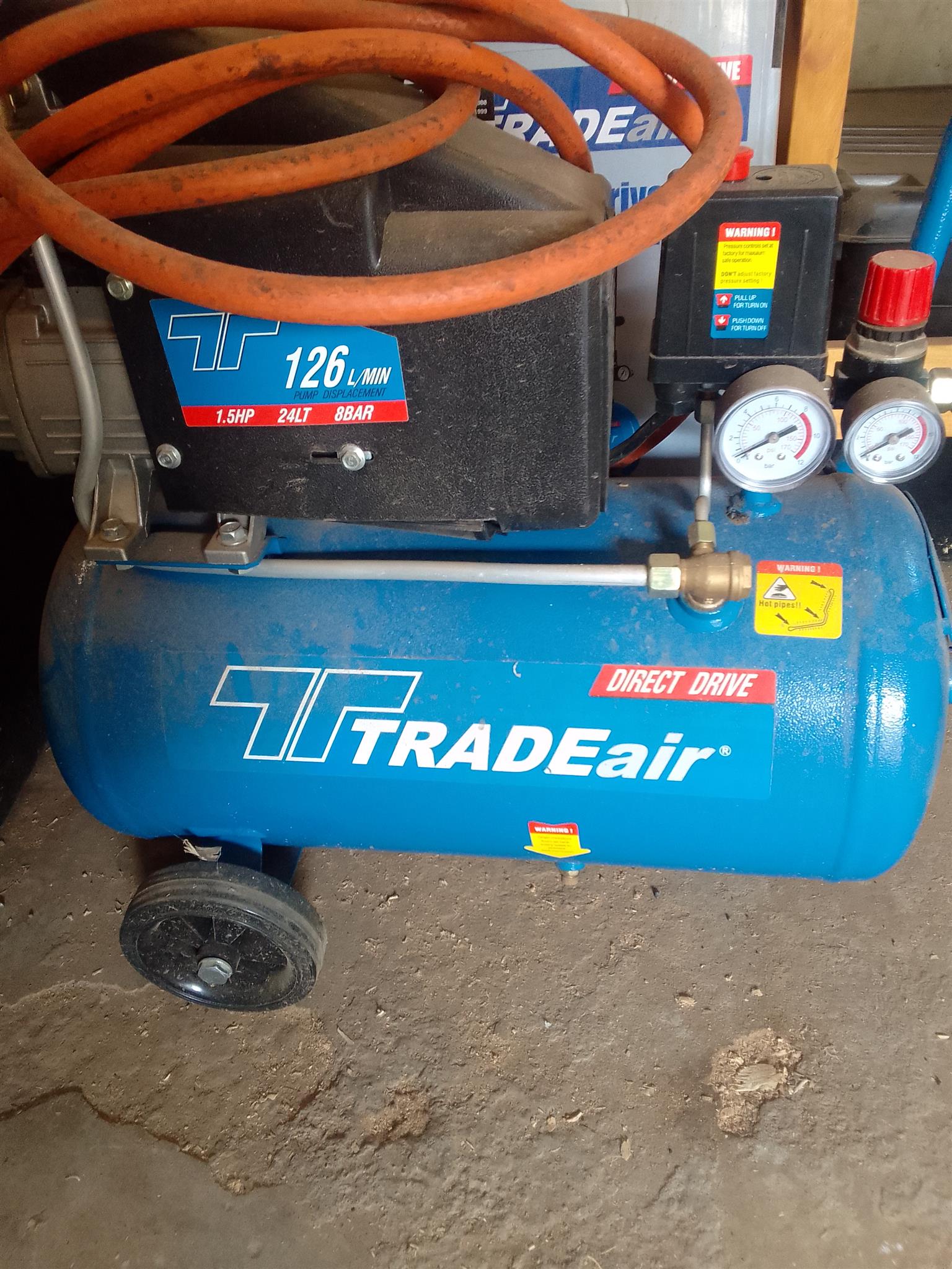 Air compressor, immaculate condition. Hardly used (+/_ 1.5 hours). 1.5 HP, 24 LT, 8 BAR. 126 L/MIN.