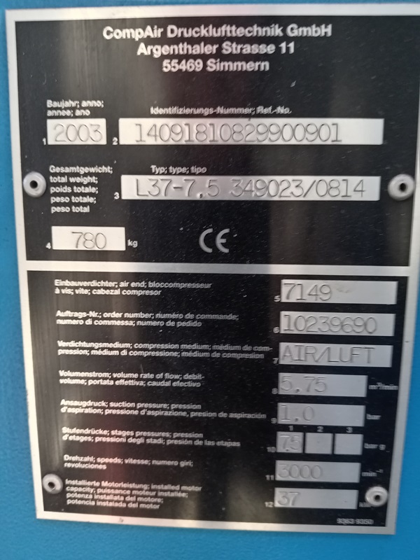 CompAir L37-10 Screwfan Compressor. 10 Bar. Constant Pressure: 8.5 bar.