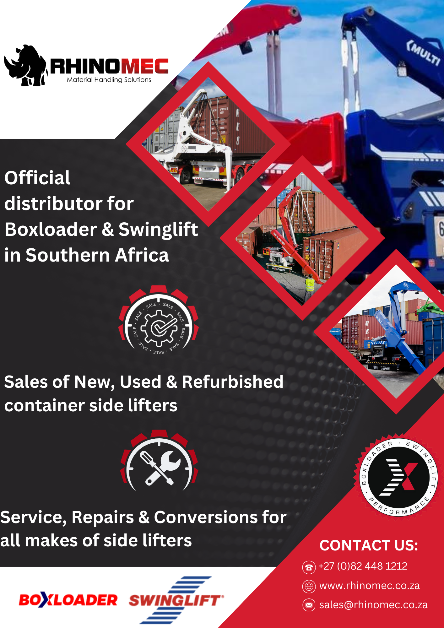 Variety of makes and models container side loaders available for sale. Rhinomec is the proud, sole distributor of Boxloader and Swinglift container side loaders in South Africa, Namibia, Botswana, Zimbabwe, Mozambique and Zambia.