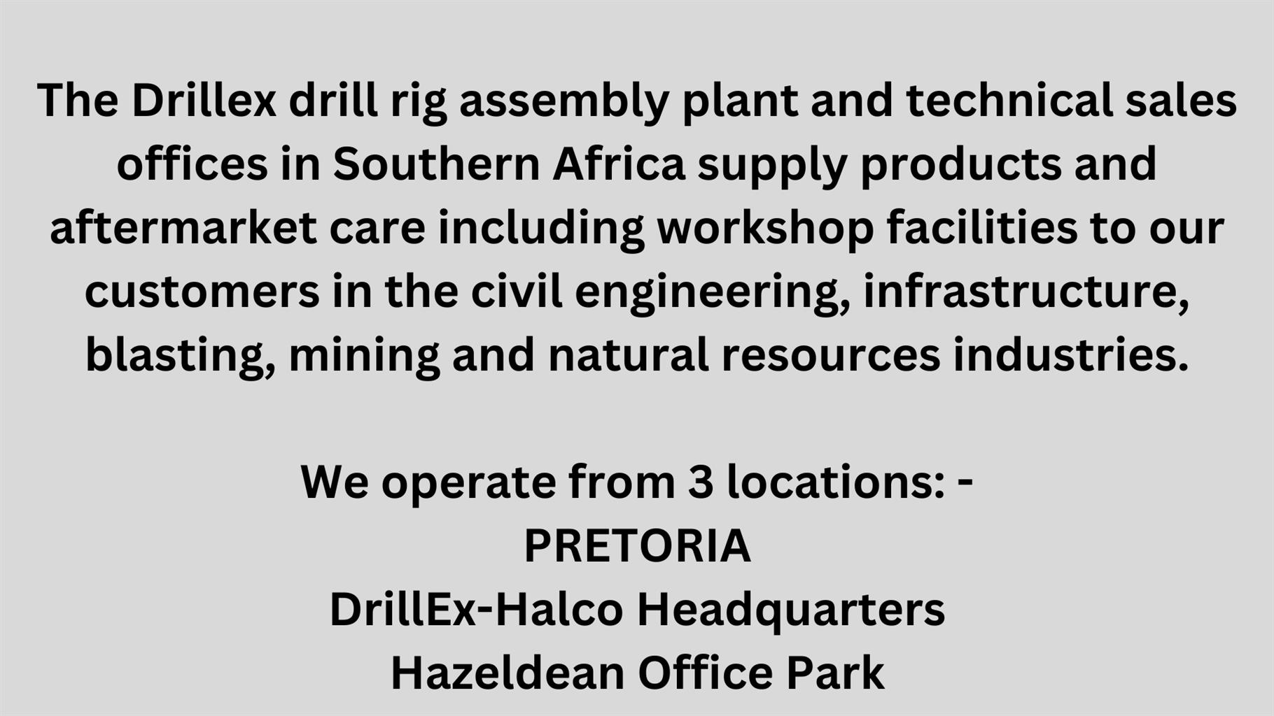 By way of introduction, we are the Aluwani Group, a Level One mining supply and manufacturing group based in Johannesburg, Pretoria and Polokwane, South Africa. We manufacture and assemble the Drillex Exploration and Blast Hole range of drilling machines and supply HALCO Rock Drilling Ground Engaging Tools to the greater Southern African and Madagascan regions.