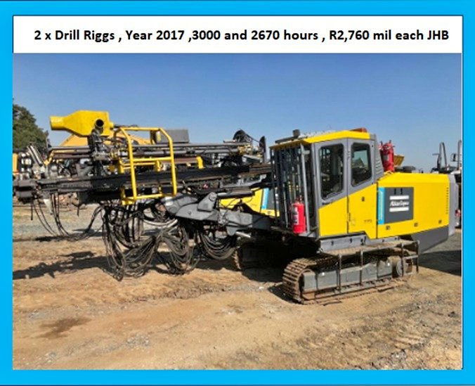 Drill Riggs Atlas Copco 2017 Models 3000 Hours 2670 Hours Area:JHB We also sell New or used. Mining equipment ,Wash plants DMS & Jig plants from 50tph-1000tph. For Coal , Gold & Diamonds , Chrome. Crushers , Conveyers for Mines Ext . New or used. Excavators, Trucks ,Side lift Trucks , Diggers , Fork lifts , Containers . Earth moving equipment. Pumps, Conveyers & Conveyer belts. All size Tyres for the above,including car tyres. New or used. Generators from 5kva - 2000kva , Transformers . New only Solar kits installed from 3kva-32kva & Back up power kits Installed . Solar Inverters,Lithium Batterys , Solar panels . All Types of Mounting brackets Including Solar Kits car ports And Solar farms Installed. All brands on request . New only Solar Geysers New only. Plug in Trolley Inverters & Power Stations. Phone: ( [hidden information] George WhatsApp Email: view email... Company Registration number: 2017/038176/07 Lidl pty ltd
