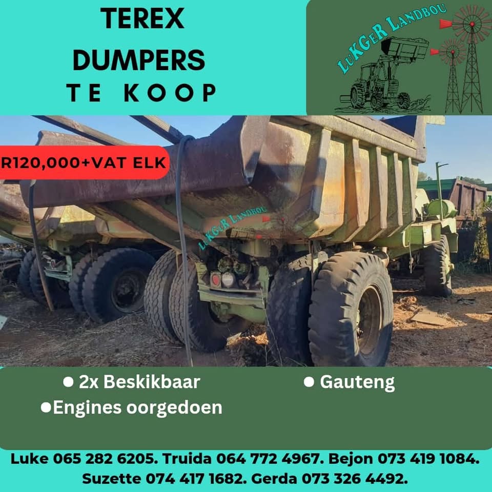 Terex dumpers 2 x beskikbaar, engines oorgedoen. R120,000.00 + vat elk. Gauteng. Kontak Gerda 0733264492view more