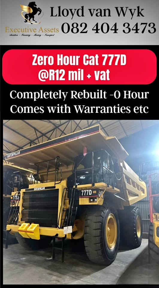 4x Cat 777D Complete rebuilds @R12 mil + vat Each. The D-Series is bulletproof and virtually indestructible...Comes with Warranties etc. Zero Hours and ready to work! Please Contact Lloyd 0️⃣8️⃣2️⃣4️⃣0️⃣4️⃣3️⃣4️⃣7️⃣3️⃣
