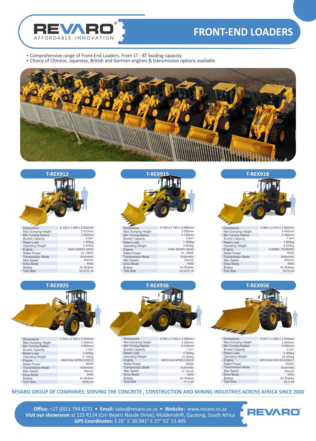 T-REX front end loaders come in a range from T-REX 912 1.2 tons R 195000, T-REX 915 1,5 tons . T-REX 918 1,8 tons R