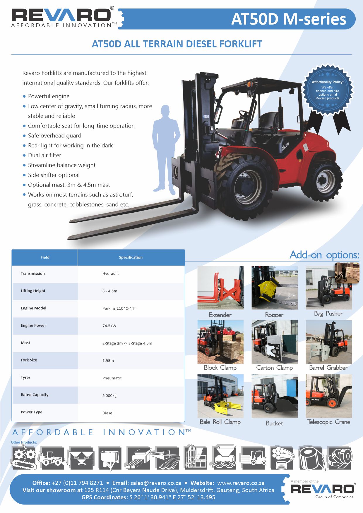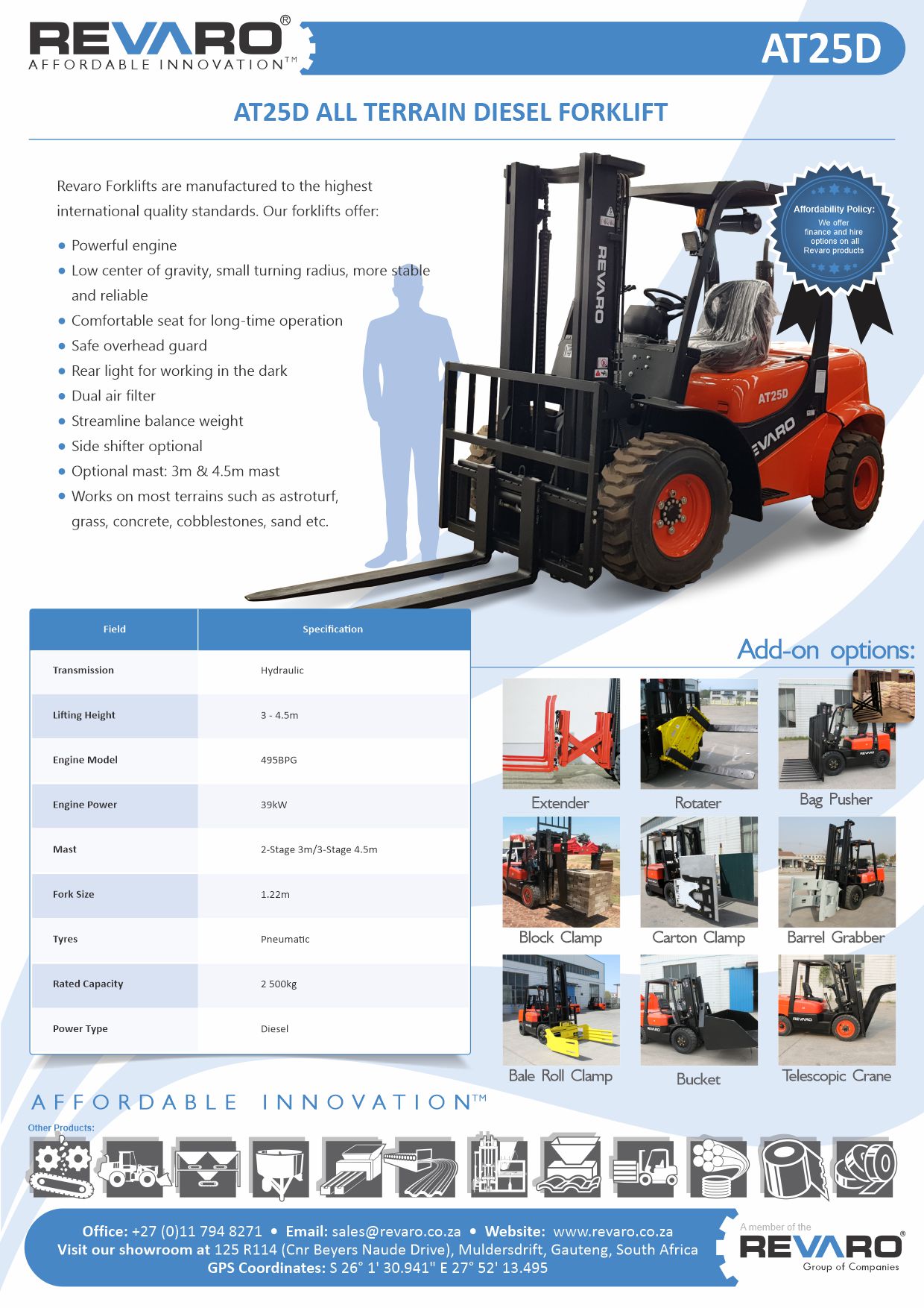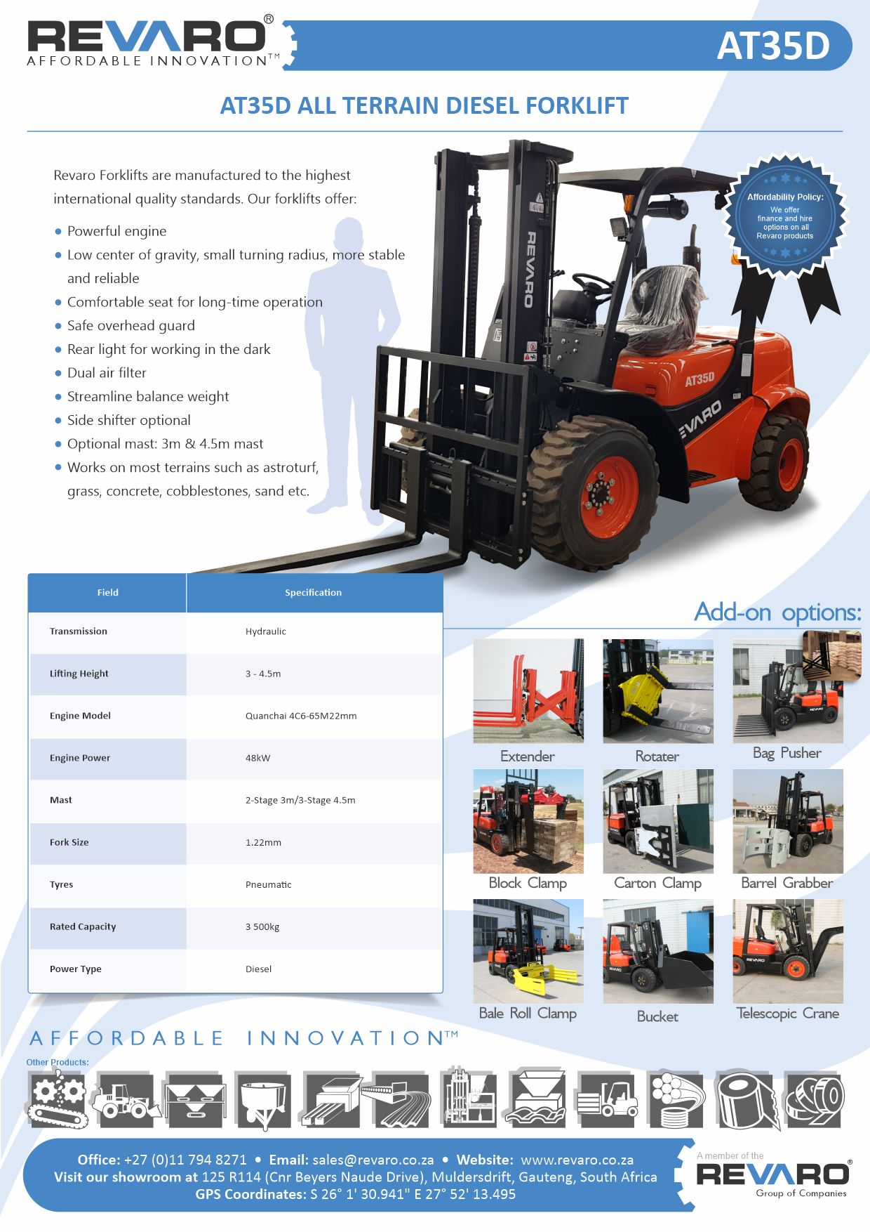 Revaro AT3.5 ALL Terrain forklifts go anywhere Will not get stuck in uneven terrain Comes with 3 or 4.5m mast