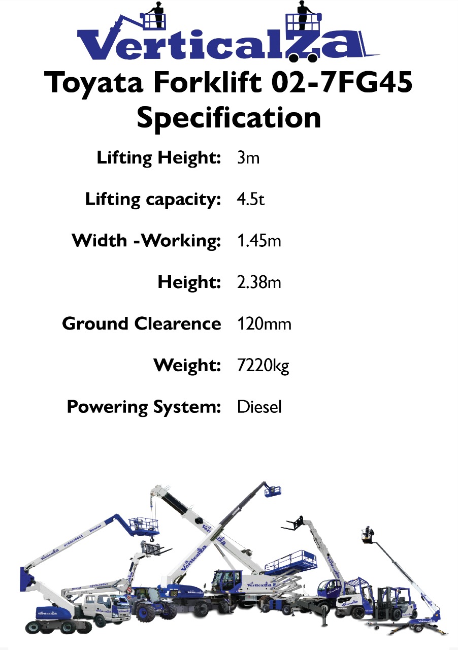 VerticalZA - Get the job done with the Toyota 02-7FG45 gas Forklift. This reliable and durable machine is perfect for construction, manufacturing, and warehouse operations indoor and outdoor. With a maximum lifting capacity of 4.5 ton, this gas forklift can handle heavy loads with ease. It features a compact design, allowing it to navigate tight spaces with ease. For Rent on Daily/ Weekly/ Monthly Basis, Call: 076-553-0053view more or visit VerticalZA on our website www.verticalza.co.za.