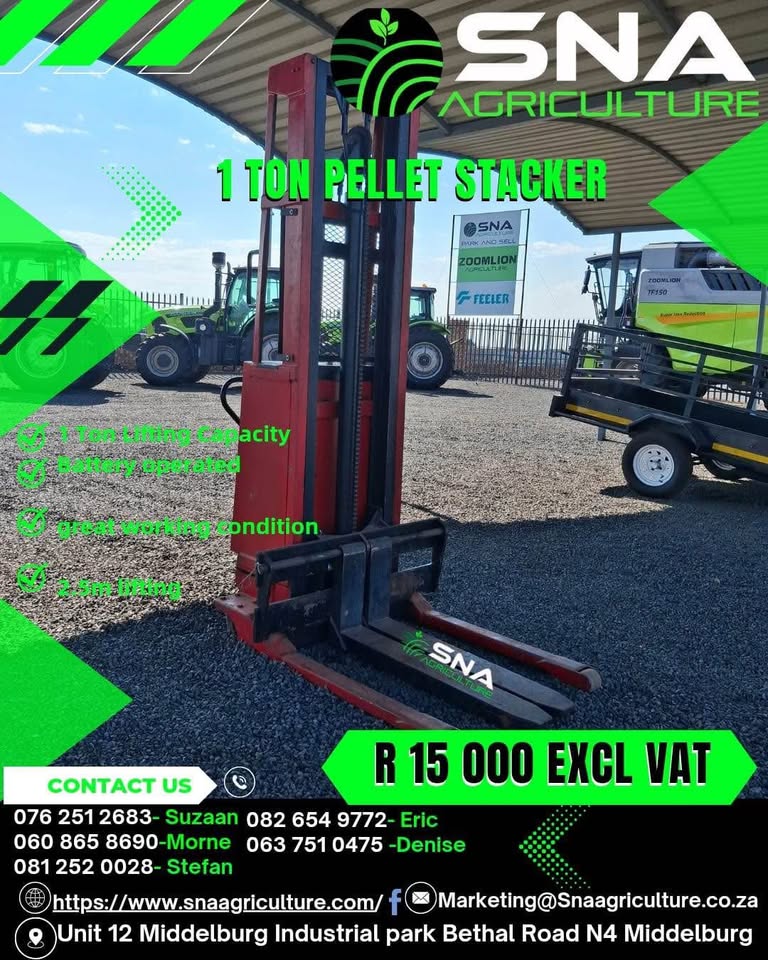 ⚡️1 Ton Pellet Stacker⚡️ 💸R15,000 excl vat -1 Ton lifting Capacity -Battery Operated 📍𝐋𝐨𝐜𝐚𝐭𝐢𝐨𝐧: 𝐔𝐧𝐢𝐭 𝟏𝟐 𝐌𝐢𝐝𝐝𝐞𝐥𝐛𝐮𝐫𝐠 𝐈𝐧𝐝𝐮𝐬𝐭𝐫𝐢𝐚𝐥 𝐩𝐚𝐫𝐤, 𝐁𝐞𝐭𝐡𝐚𝐥 𝐑𝐨𝐚𝐝 📱𝐂𝐨𝐧𝐭𝐚𝐜𝐭: 𝐃𝐞𝐧𝐢𝐬𝐞 (𝐖𝐡𝐚𝐭𝐬𝐀𝐩𝐩 - 𝐂𝐚𝐥𝐥𝐬) +𝟐𝟕 𝟔𝟑 𝟕𝟓𝟏 𝟎𝟒𝟕𝟓 📧 𝐞𝐦𝐚𝐢𝐥: 𝐒𝐚𝐥𝐞𝐬𝟐@𝐬𝐧𝐚𝐚𝐠𝐫𝐢𝐜𝐮𝐥𝐭𝐮𝐫𝐞.𝐜𝐨.𝐳𝐚