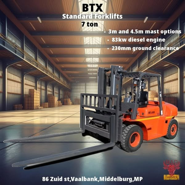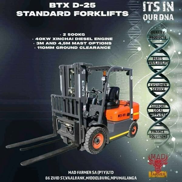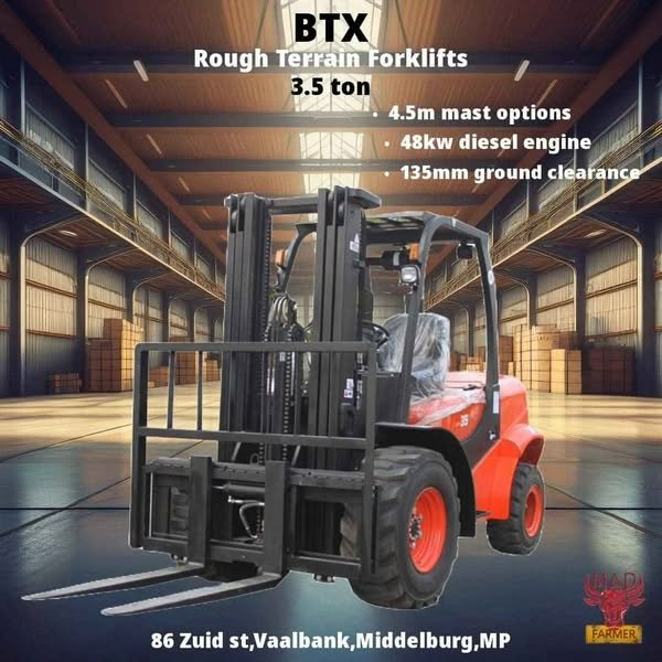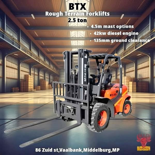 Range Of Standard And Rough Terrain Forklifts Available For Sale At Mad Farmer SA Zuid Street Middelburg Mpumalanga For All Your Farming Needs - BTX D25 2.5 Ton Standard Forklift - BTX D35 3.5 Ton Standard Forklift - BTX RT25 2.5 Ton Rough Terrain Forklift - BTX RT35 3.5 Ton Rough Terrain Forklift - BTX 5 Ton Standard Forklift - BTX 7 Ton Standard Forklift ** Warranties On All Our Equipment ** ** Full Parts And After Sales Service ** ** ** ** Call : ** ** Whatsapp : **
