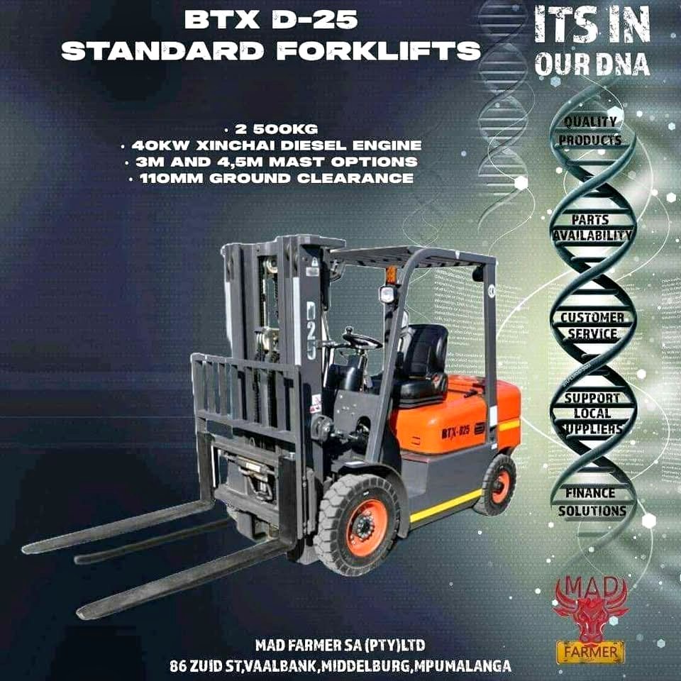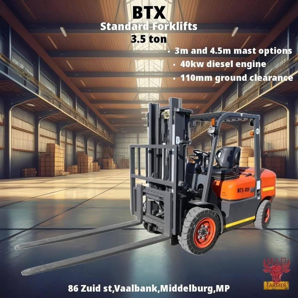 New BTX Standard Forklifts Available For Sale At Mad Farmer SA Zuid Street Middelburg Mpumalanga For All Your Farming Needs BTX D-35 - 3500Kg - - 40kW Xinchai Diesel Engine - - 3.0Mtr And 4.5Mtr Mast Options - - 135mm Ground Clearance - BTX D-25 - 2500Kg - - 40kW Xinchai Diesel Engine - - 3.0Mtr And 4.5Mtr Mast Options - - 110mm Ground Clearance - ** Warranties On All Our Equipment ** ** Full Parts And After Sales Service ** ** ** ** Call : ** ** Whatsapp : **