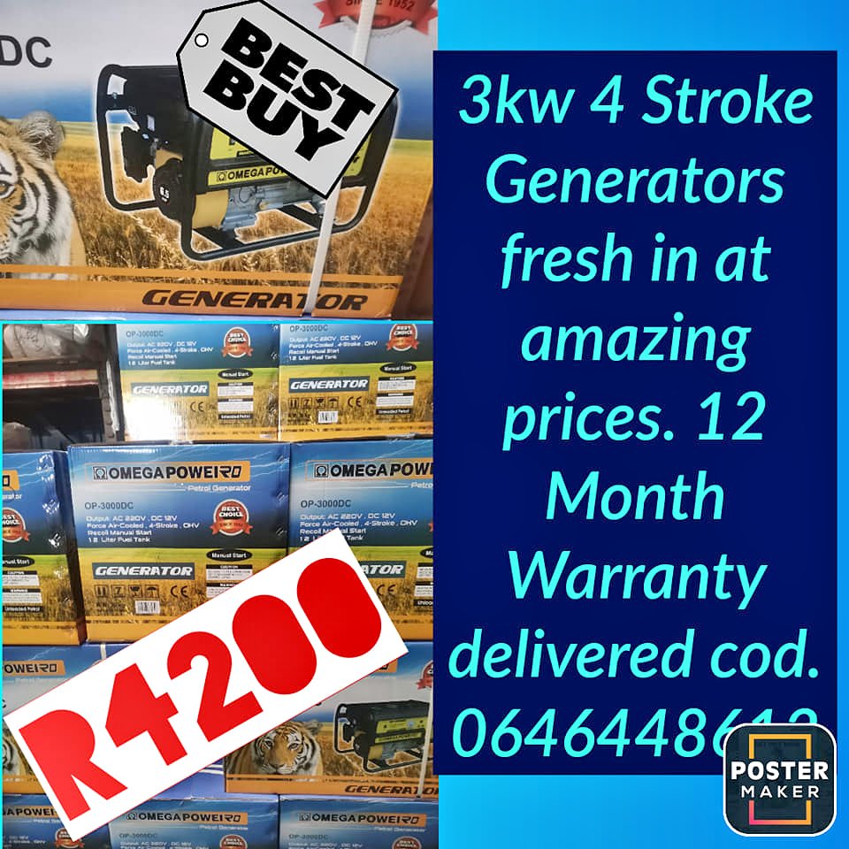 3kw 4 Stroke Generators fresh in at amazing prices. 12 Month Warranty delivered cod.