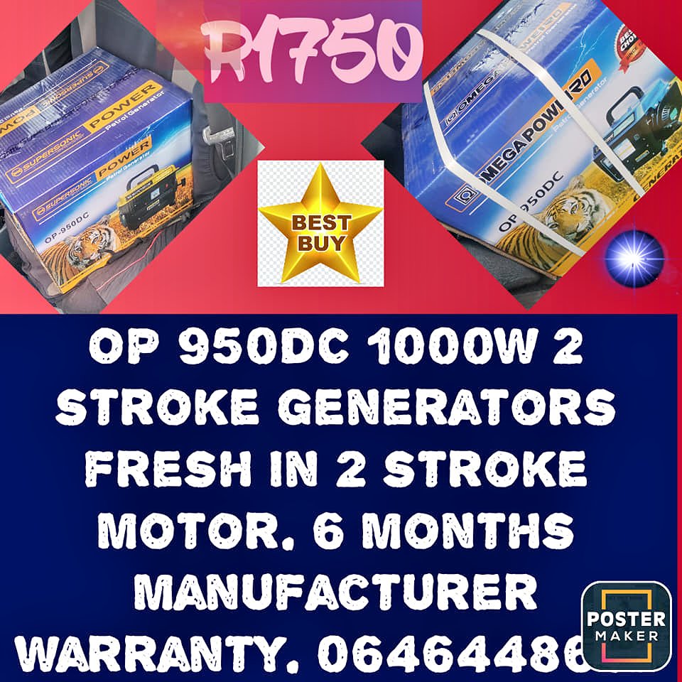 OP 950DC 1000w 2 stroke generators fresh in 2 stroke motor. 6 months manufacturer warranty.