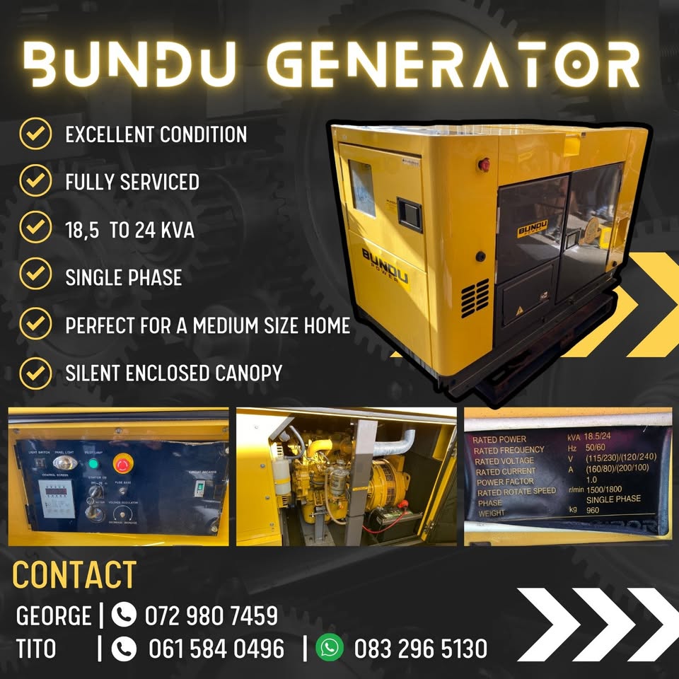 21 kva /18kva prime with new AVR Fitted location Edenvale . (We buy & sell new Gens ) 150 kva Lovol with ATS 2850 hours. JHB R195k ex vat (We buy & sell new Gens From 5kva to 2200 kva) We also have these Gens at Good prices. 100 kva Dong fang hong with ATS R69k no vat 500 kva Deutz Silent with ATS R859k ex vat 750 KVA Doosan (Only done 80 hours ) Ats Silent Location Cape Town Price R 1.78 mil no vat 165 kVA Standby 150 kva prime rated Cummins block housed in sound attenuated canopy with 6120 deep sea controller base load self start R 349k ex vat 250 Amp separate automatic change over panel. R 22k excluding vat delivery and Installation. 100 kva Kirloskar with ATS Fully automatic R153k no vat We also have these Gens and many more. 3 Phase Ricardo Diesel 10/20/30/50/65/75/80/100/150/200/400/600 kva Size Phase brand 10 kva 3 Phase Ricardo Diesel R45k 20 kva 3 Phase Ricardo Diesel R110k 30 kva 3 Phase Ricardo Diesel R128k 50 kva 3 Phase Ricardo Diesel R148k 65 kva 3 Phase Ricardo Diesel R171k 75 kva 3 Phase Ricardo Diesel R190k 80kva 3 Phase Ricardo Diesel R215k 100kva 3 Phase Ricardo Diesel R237k 150 kva 3 Phase Ricardo Diesel R297k 200 kva 3 Phase Ricardo Diesel R478k 400 kva 3 Phase Ricardo Diesel R645k 600 kva 3 Phase Ricardo Diesel R1,075k (Gens 7.5kva to 2200 kva) We Buy and sell new Gens. Volvo Penta 200 KVA/250/300/350/400/450/500/590/ 650/700KVA SDEC 63 KVA/80/112/125/200/250/300/350/ 40 Baudouin Generators 20KVA/23/46/80/100/150/200/320/400/ 500/650/750/1000 kva FAW Generators prime power output 12KVA/15/20/23/30/40/50/60/150kva Contact George [hidden information] WhatsApp only