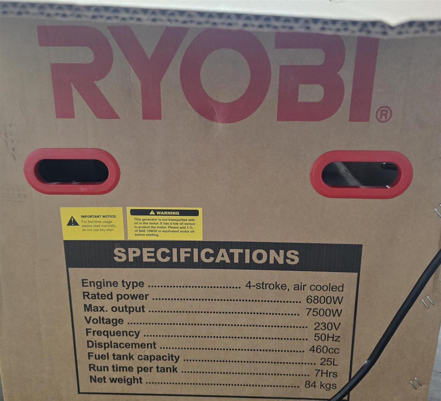 Ryobi RG-7900K 4-Stroke, petrol Generator for sale. Only ran 3 times, as new, still in the box. 4-stroke. Till slip also available for the Guarantee.