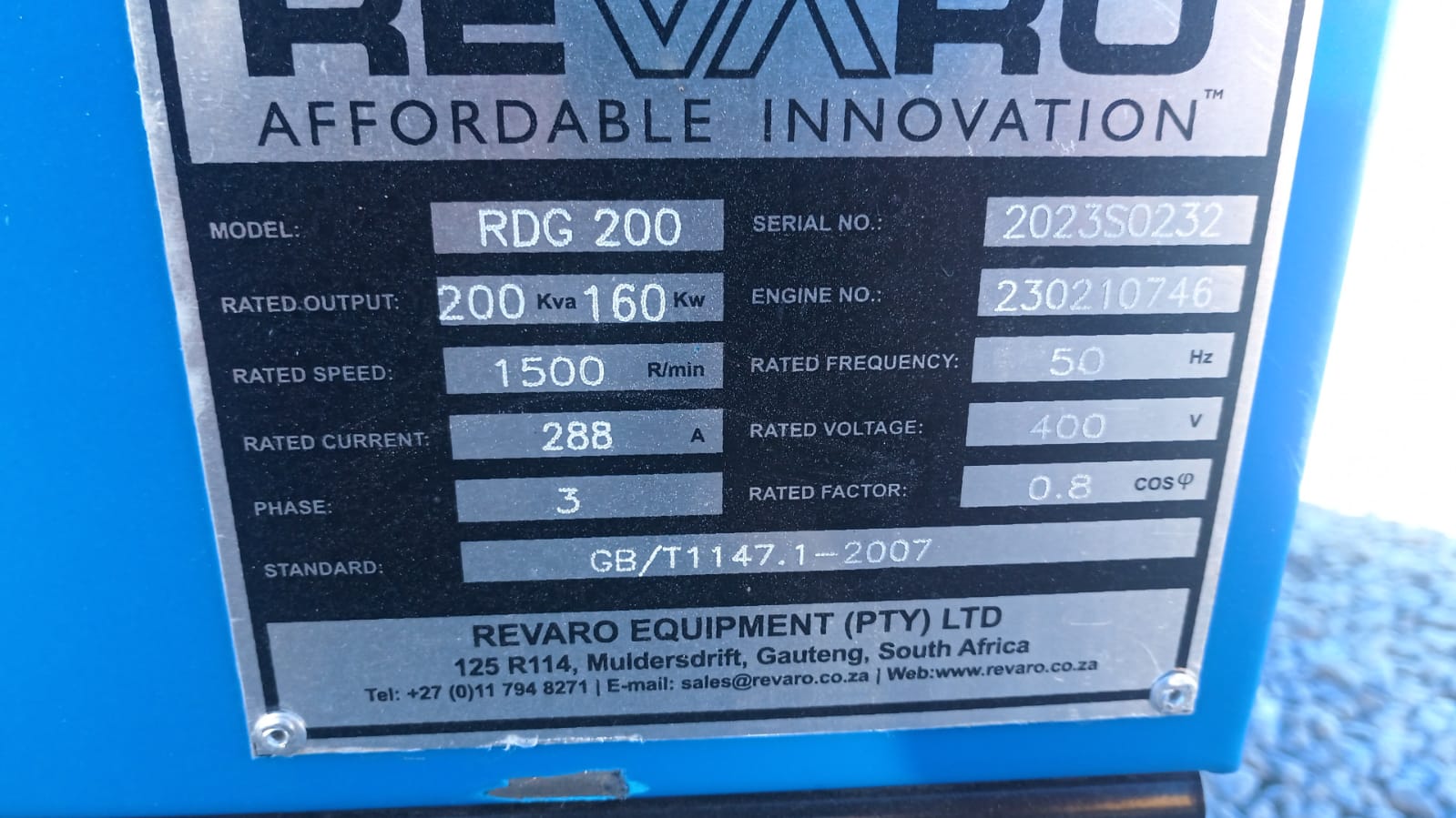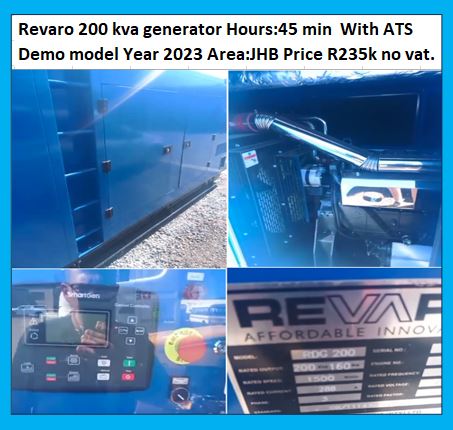 Revaro 200 kva generator Demo model Hours:45 min With ATS Price R225k no vat . Area:JHB Year 2023